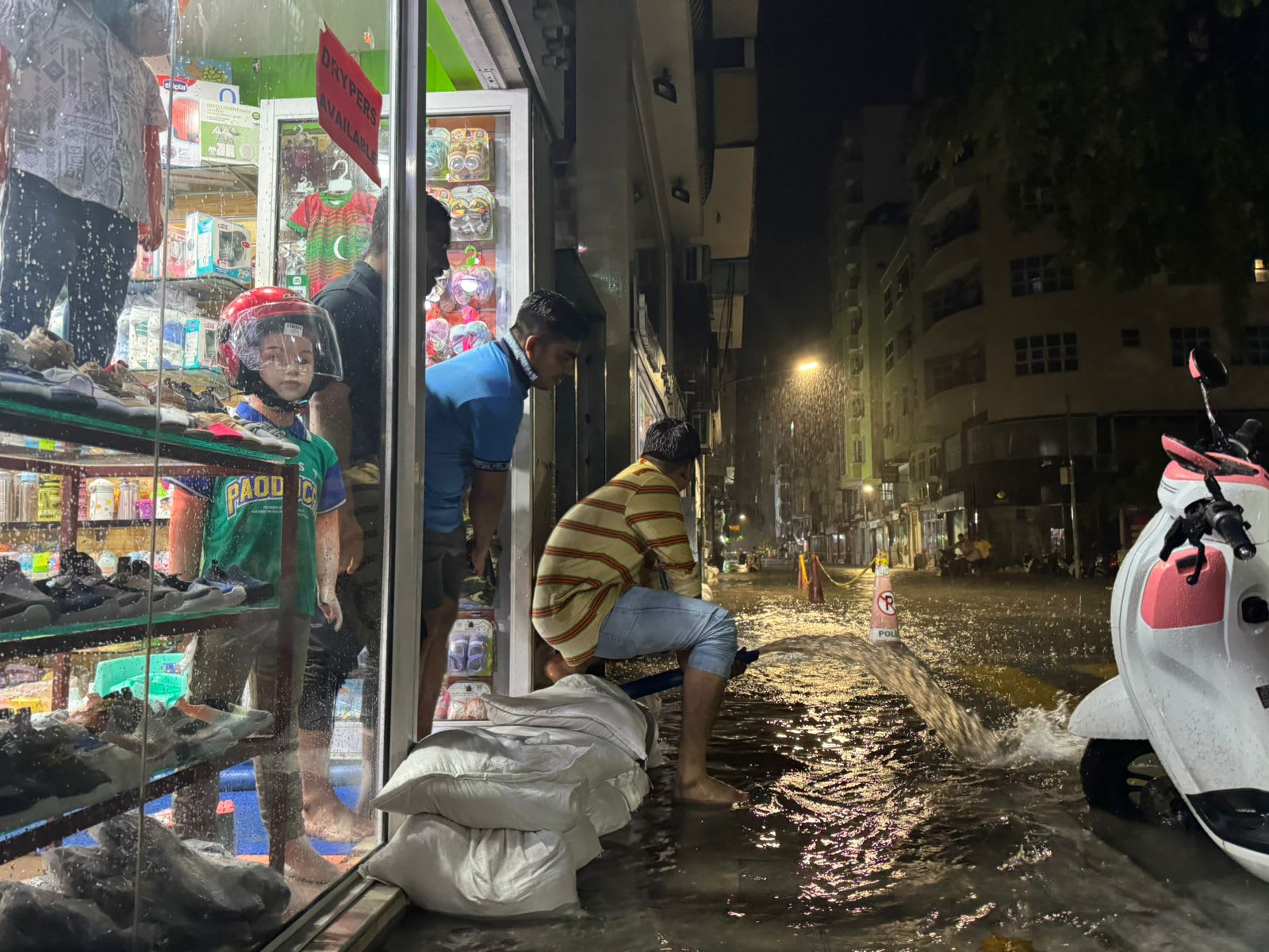 މަޖީދީމަގުގައި ހުރި ފިހާރައެއްގައި ބޮޑުވެފައިވާ ފެންގަނޑު ޕަންޕު ބޭނުންކޮށްގެން ހިއްކުމުގެ މަސައްކަތް، އެ ފިހާރައިގެ މުވައްޒަފުން ކުރަނީ. -- ފޮޓޯ: އަދަދު