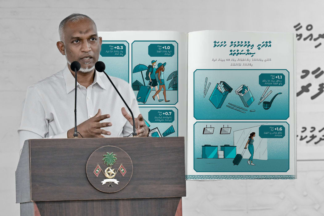 ަރައީސް ޑރ. މުހައްމަދު މުއިއްޒު ޕޯޑިއަމެއްގައި ވާހަކަދައްކަވަނީ: އާމްދަނީ އިތުރުކުރާ ސިޔާސަތުތަކުގެ ތެރޭގައި ސިނގިރޭޓުގެ ޑިއުޓީ ބޮޑުކުރުން ހިމެނޭ -- ގްރެފިކްސް: އިސްމާއިލް އިމްދާދު/އަދަދު