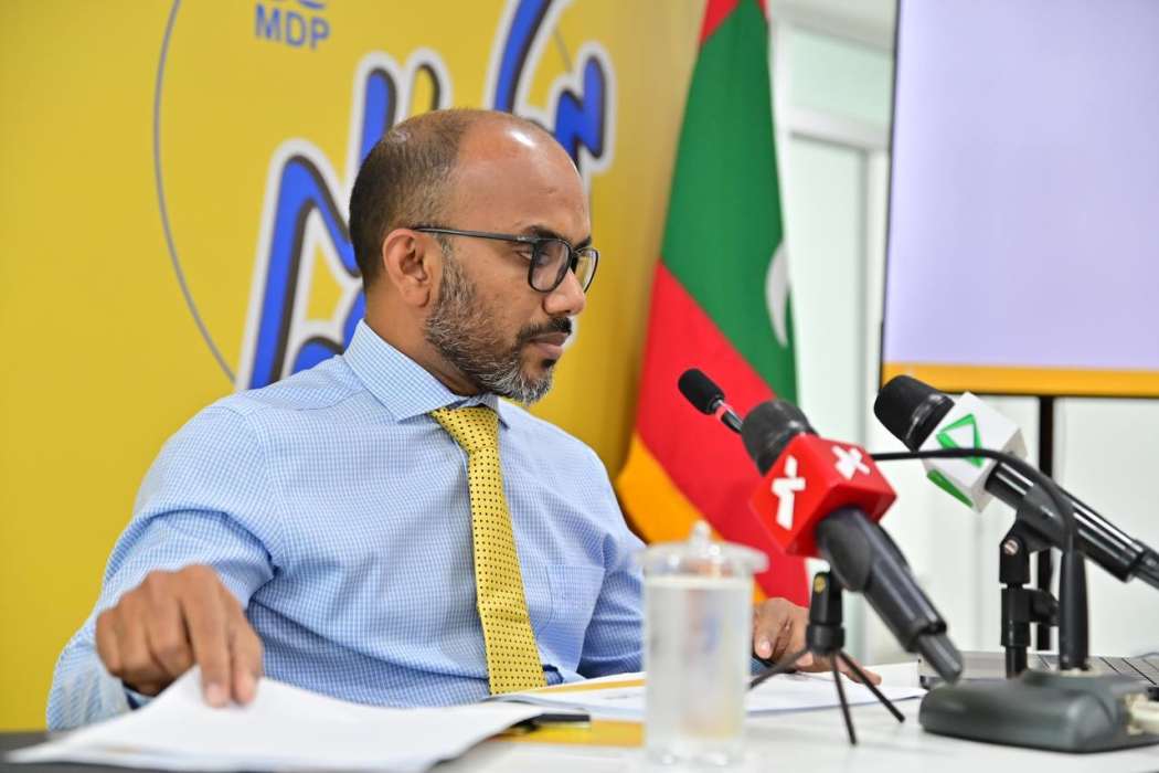 އެމްޑީޕީން ބޭއްވި ނޫސްވެރިންގެ ބައްދަލުވުމެއްގައި އަމީރު ވާހަކަ ދައްކަވަނީ.