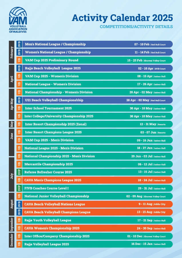 ވޮލީބޯލް އެސޯސިއޭޝަން އޮފް މޯލްޑިވްސް (ވީއޭއެމް) އިން މި އަހަރު ބާއްވާނެ މުބާރާތްތަކުގެ ކަލަންޑަރުގައި, ސެންޓްރަލް އޭޝިއާ ވޮލީބޯލް އެސޯސިއޭޝަން (ކާވާ) ގެ ބައިނަލްއަގްވާމީ ހަތަރު މުބާރާތް ރާއްޖޭގައި ހޯސްޓްކުރަން ހިމަނައިފި އެވެ.