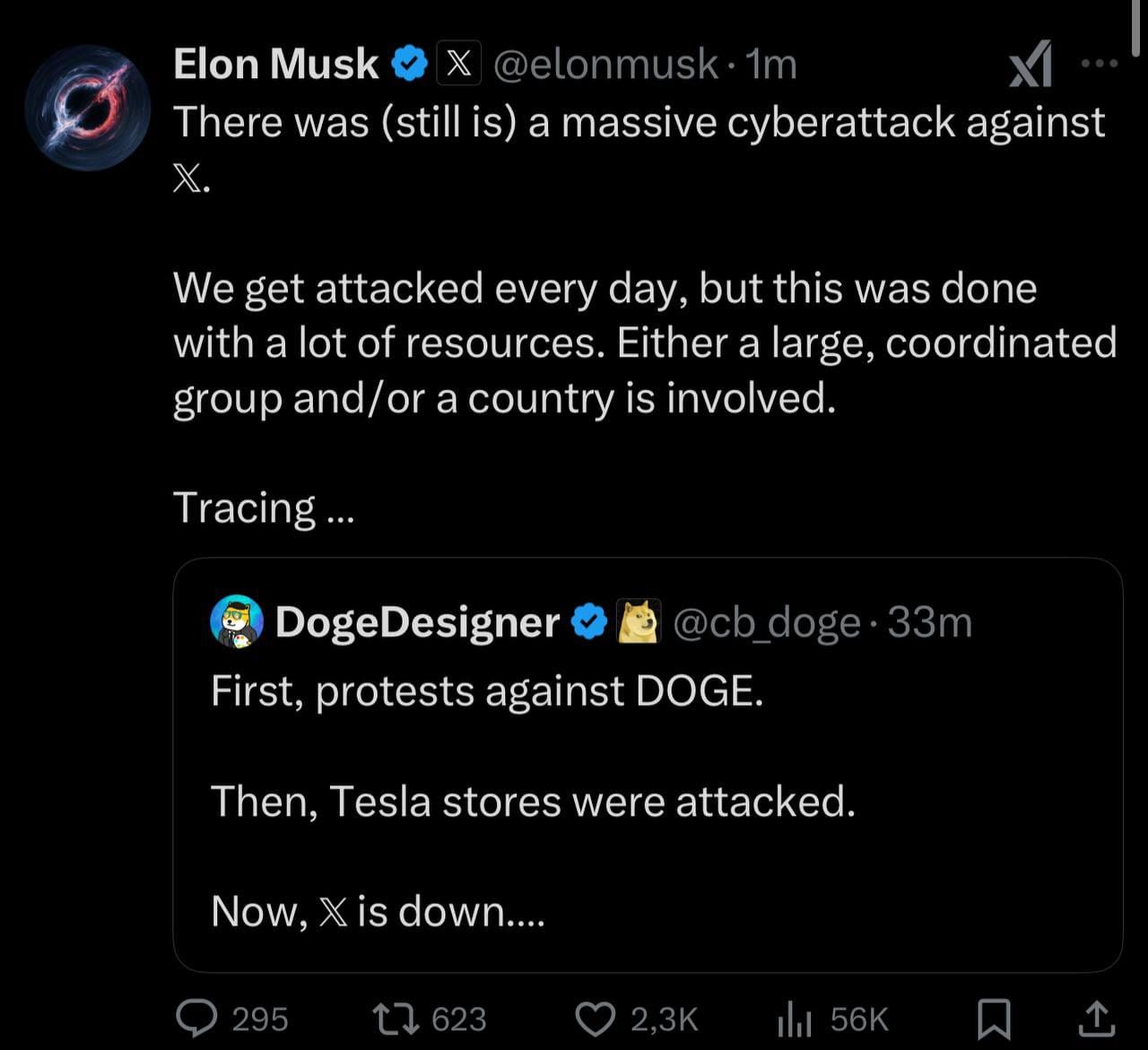 ސޯޝަލް މީޑިއާގައި ފެތުރެމުންދާ ހަބަރުތަކުން ދައްކާ ގޮތުގައި، އެކްސްއަށް މި ހަމަލާ ދިނުމުގެ ކުރިން ޑޯޖްކޮއިން ކްރިޕްޓޯކަރަންސީއަށް ދެކޮޅު އިހުތިޖާޖުތަކާއި، ޓެސްލާ ސްޓޯތަކަށްވެސް ހަމަލާތަކެއް ދީފައިވާކަމަށް ބުނެވެއެވެ.