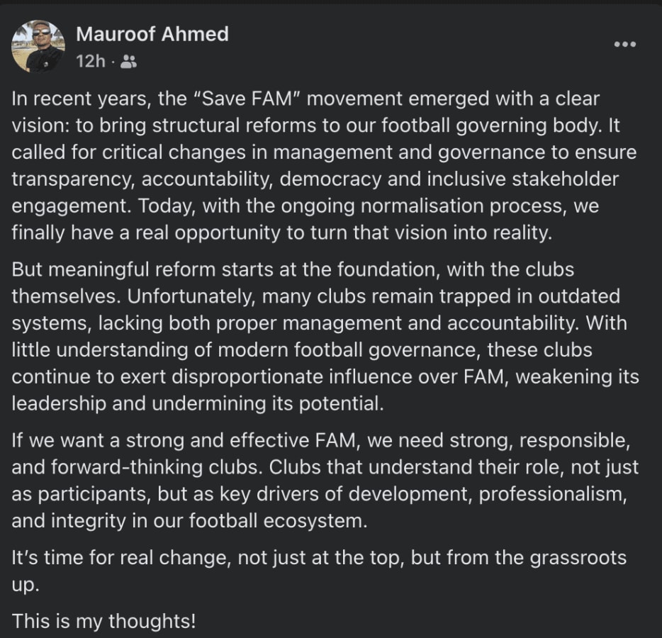 "ހަގީގީ މާނައިގައި ކަންކަން ރަނގަޅު ކުރެވިގެންދަނީ ރަނގަޅު ފައުންޑޭޝަނަކާ ހަމައިން. ހިތާމަ އަކީ ގިނަ ކްލަބްތައް މި ހިނގަނީ މިހާރު ކަންކަން ހިނގާ އުސޫލާ ނުބައްދަލު ގޮތްގޮތަށް. ރަނގަޅު މެނޭޖްމަންޓެއްގެ ތެރެއިން ޖަވާބުދާރީ ކުރެވޭނެ އުސޫލެއްގެ ތެރެއިންނެއް ނޫން. ފަހުގެ ފުޓްބޯޅައިގެ ގަވަނަންސް ތެރެއިން ކަންކަން ކުރުމުގެ ބަދަލުގައި، ކްލަބްތަކުން ކުރަމުން އަންނަ ކަމަކީ އެފްއޭއެމަށް ނުރަނގަޅު ނުފޫޒު ފޯރުވުން، އޭގެއިން ވަނީ ފުޓްބޯޅައިގެ ލީޑަޝިޕް ބަލިކަށި،" އިނގިރޭސި ބަހުން، މާއްޓޭ ލިޔެފައިވާ ޕޯސްޓުގައި ބުނެފައިވެ އެވެ.