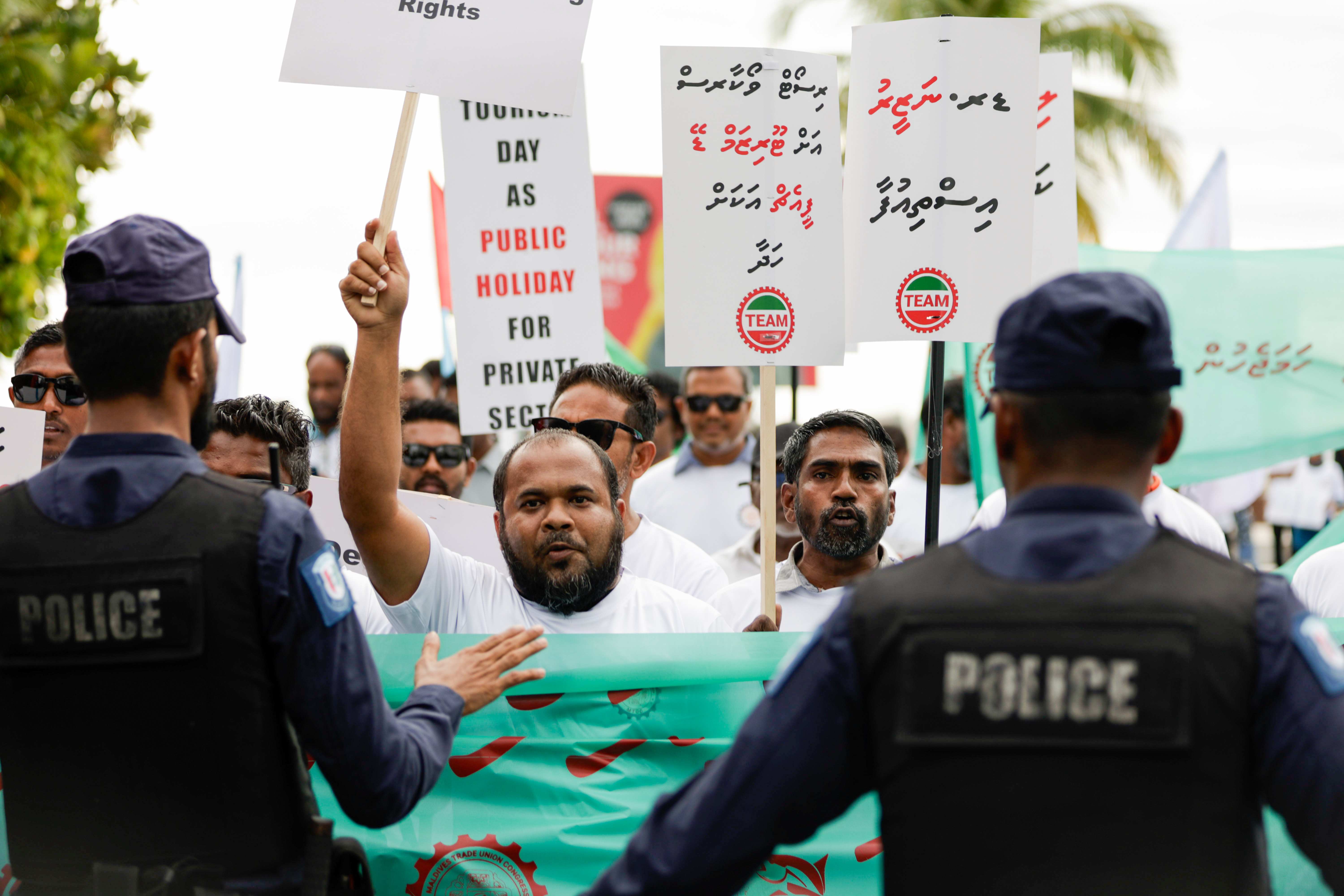 މޭ ޑޭ ރެލީއަށް ފުލުހުން ހުރަސް އަޅަނީ. ރެލީއަށް ފުރުސަތު ދޭނެ ކަމަށް ބުނުމަށް ފަހު ފަހު ވަގުތު ފުލުހުންގެ ނިންމުން ބަދަލުކޮށްފައިވާ ކަމަށް އިންތިޒާމު ކުރާ ފަރާތްތަކުން ބުނޭ --- ފޮޓޯ: އަދަދު