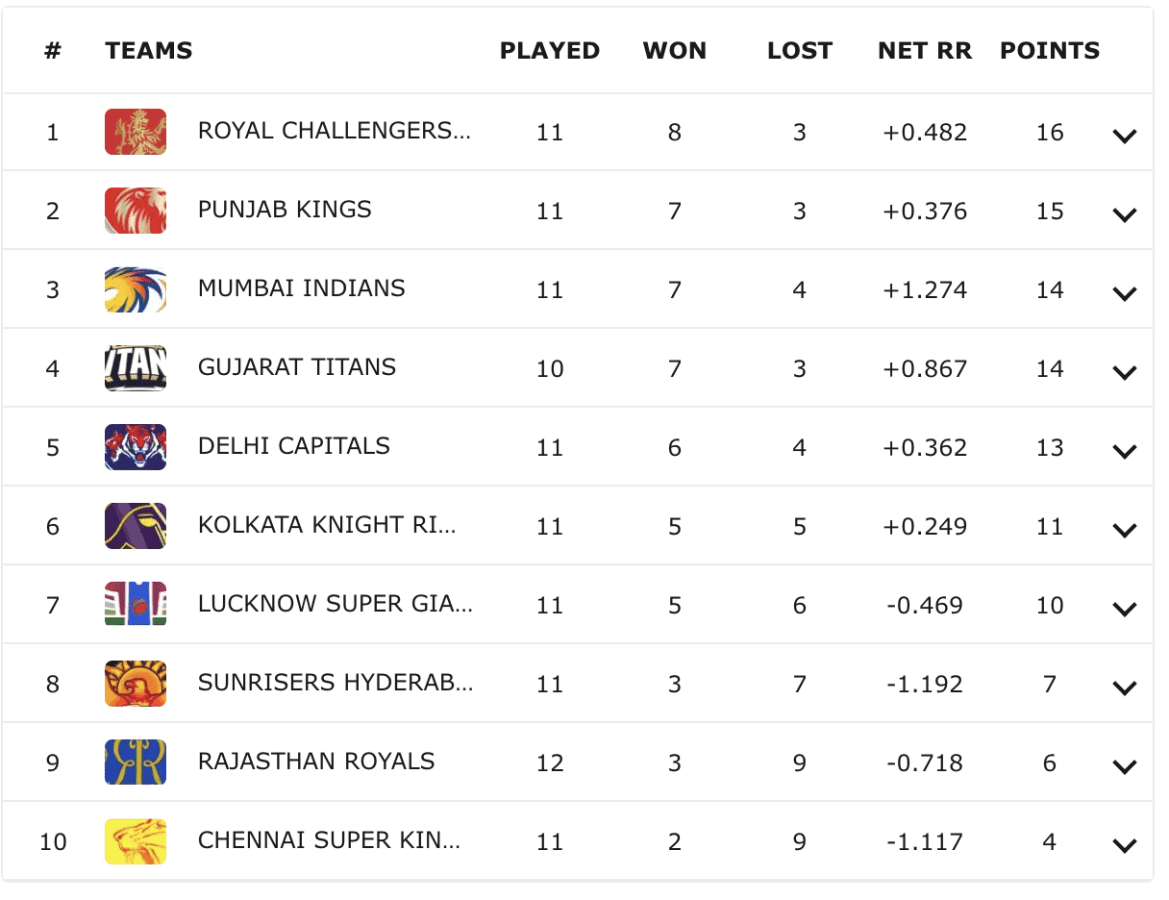 ނިއު ދިއްލީ، އިންޑިއާ (މެއި 6) - މިހާރު ކުރިއަށްދާ ދުނިޔޭގެ އެންމެ ފޯރިގަދަ ފްރެންޗައިސް ކްރިކެޓް ލީގު ކަމަށްވާ އިންޑިއަން ޕްރިމިއާ ލީގު (އައިޕީއެލް)ގެ މި އަހަރުގެ ސީޒަނުގެ ލީގު ބުރުގެ ފަހު މެޗުތަކަށް ކުރިމަތިލާއިރު، ޕްލޭއޮފްގެ ހަތަރު ޖާގަ އަށް ހަތް ޓީމެއްގެ ވާދަވެރިކަން ބޮޑުވެފަ އެވެ.