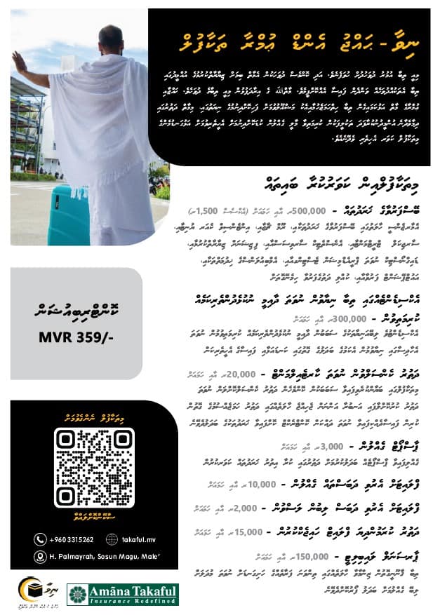 ނިވާ ހައްޖު އެންޑް އުމްރާ ތަކަފުލްގެ ޕެކޭޖްތައް ލިބެނީ 30 ދުވަހަށް ކަމަށާއި، ޕެކޭޖަށް އެޕްލައި ކުރުމަށް އޮންލައިންކޮށް އަމާނަ ތަކަފުލްގެ ވެބްސައިޓް https://takaful.mv އޮންލައިން ކޮށް ބައްލަވައި ގަނެވޭނެ އަދި ޕްރޮޕޯސަލް ފޯމާއި ޕާސްޕޯޓް ކޮޕީ އަމާނާތަކާފުލްގެ އޮފީސް، ހ.ޕަލްމޭރާ، ސޯސަންމަގަށް ހުށަހެޅުމަށް އެ ކުންފުނިން ވަނީ އެދިފަ އެވެ.