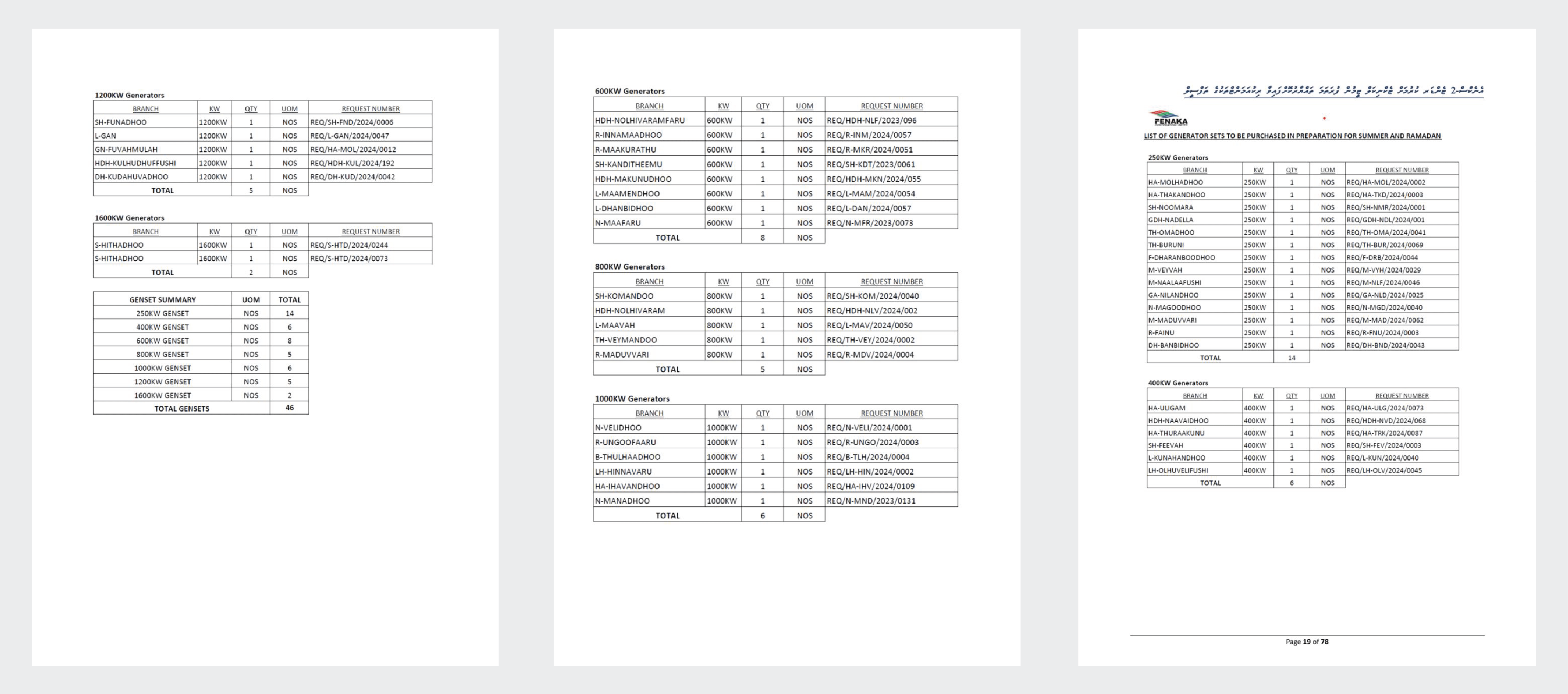 އެ ލިސްޓުގައި އޮތް ގޮތުން މިދިޔަ ރޯދަ މަހުގެ ކުރިން އެ ކުންފުންޏަށް 46 ޖެންސެޓު ހޯދަންޖެހެ އެވެ. އޭގެތެރޭގައި މިދިޔަ ރޯދަ މަހު އެންމެ ބޮޑަށް ކަރަންޓުގެ މައްސަލަ ކުރިމަތިވި އަައްޑޫ ސިޓީއަށް ގެންނަންޖެހޭ 1600 ކިލޯވޮޓުގެ ދެ ޖެންސެޓު ވެސް ހިމެނެ އެވެ.