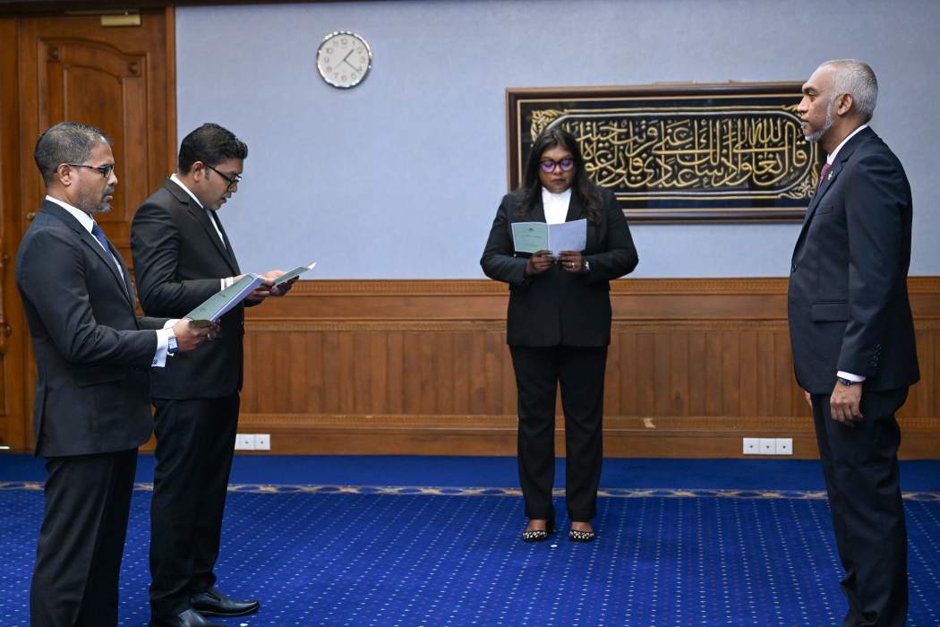 ރައީސް ޑރ. މުހައްމަދު މުއިއްޒުގެ ކުރިމަތީގައި މިއަދު ދެ ބޭފުޅުން ވެސް ވަނީ ސުޕްރީމް ކޯޓުގެ ފަނޑިޔާރު ކަމުގެ ހުވާ ކޮށް މަގާމާ ހަވާލުވެވަޑައިގެންފަ އެވެ. ހުވާ ލައިދެއްވީ އެ ކޯޓުގެ ފަނޑިޔާރު އަައިޝާ ޝުޖޫން މުހައްމަދު އެވެ.