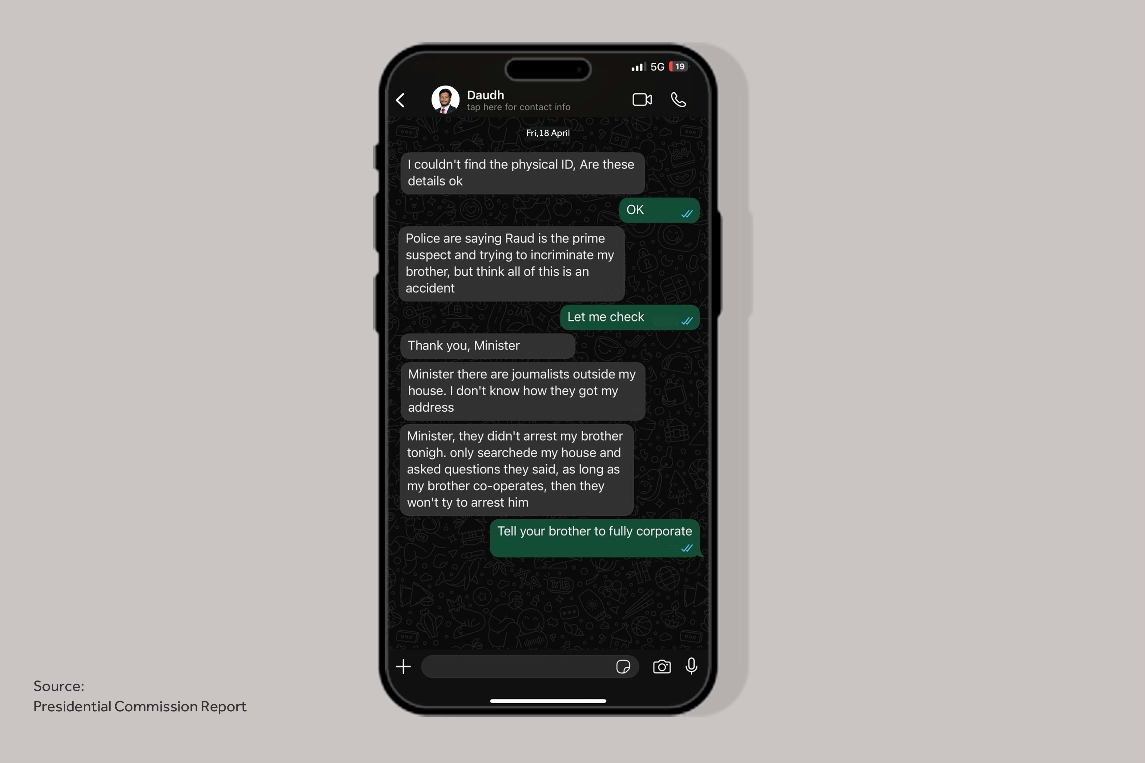 ޔުމްނު ވެއްޓުނު މައްސަލައިގައި ތުހުމަތު އަމާޒުވާ ރައުދު އަހުމަދު ޒިލާލްގެ ބޭބެ، ރައީސް އޮފީހުގެ އަންޑަ ސެކެޓްރީ ފޯ ޑިޖިޓަލް ސްޓްރެޓެޖީ ދާއޫދު ހޯމްލޭންޑް ސެކިއުރިޓީ މިނިސްޓަރަށް ގުޅައި މެސެޖު ކުރި ނަމަވެސް، ކޮމިޝަނުގެ ތަހުގީގުގައި އެފަދަ ކަމެއް ކޮށްފައި ނުވާނެ ކަމަށް ބުނެ ދޮގު ހަދާފައިވާކަން ޔުމްނު މައްސަލައިގައި އުފެއްދި ރިޔާސީ ކޮމިޝަނުން މިއަދު އާންމުކުރި ރިޕޯޓުން ހާމަވެއްޖެ އެވެ.