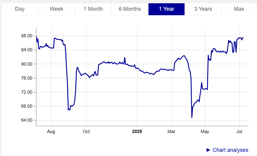 ރާއްޖޭގެ ސުކޫކު ޓްރޭޑުކުރަމުންދާ އަގު: ސުކޫކުގެ އަގު މިހާރު ވަނީ އަހަރެއްގެ ތެރޭ އެންމެ މައްޗަށް ގޮސްފަ -- ޗާޓު: ފްރެންފާޓު ސްޓޮކް އެކްސްޗޭންޖު