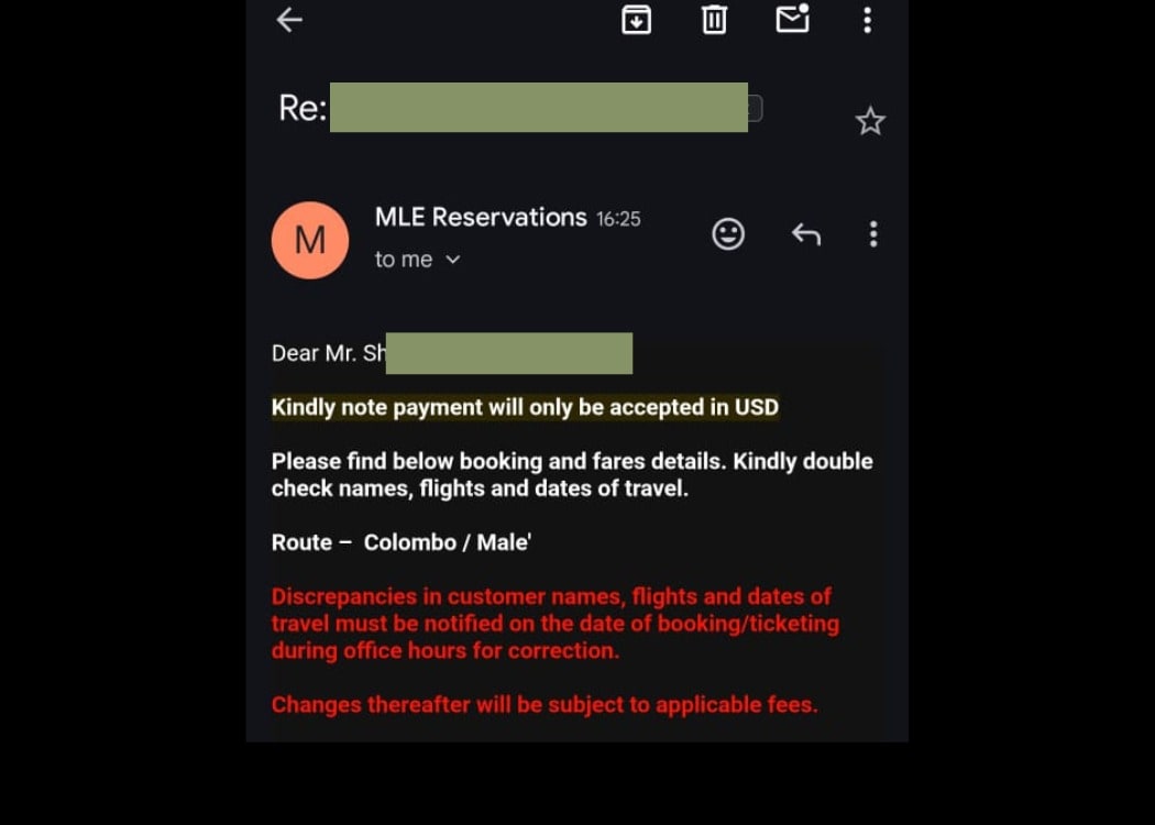 ޑޮލަރުން ފައިސާ ދެއްކުމަށް އަންގައި ޓިކެޓު ނަގަން އުޅުނު މީހަކަށް އެއާލައިނަކުން ފޮނުވާފައިވާ މެއިލްއެއް