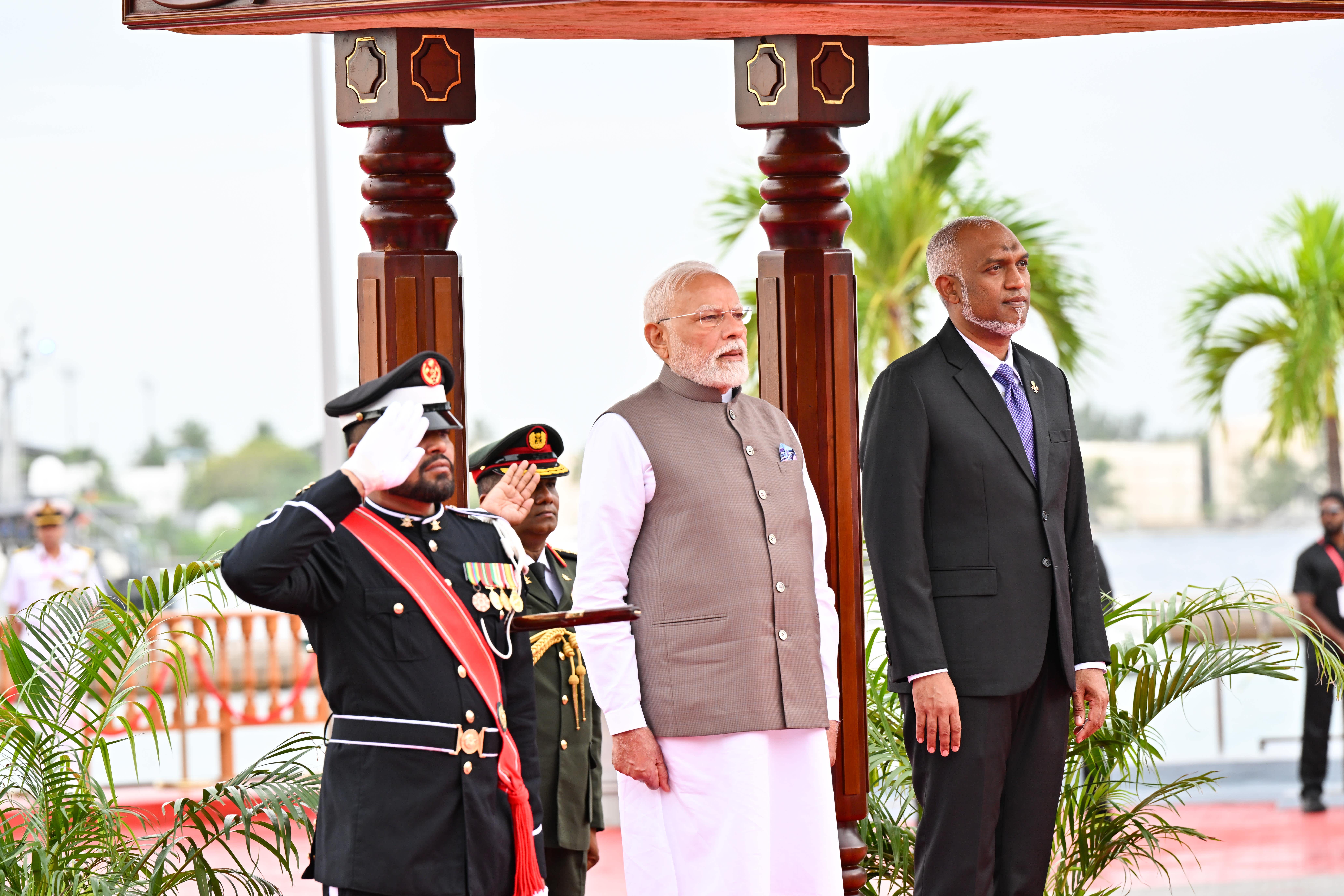 ޖުމްހޫރީ މައިދާން ސަރަހައްދުގައި މޯދީއަށް ދިވެހި ދަރިވަރުންތަކެއް ސަގާފީ ނެށުމެއް ހުށަހަޅުއްވައިދިނެވެ. އެއަށްފަހު ދިވެހި ސިފައިންގެ ފަރާތުން އެމަނިކުފާނަށް 21 ބަޑީގެ ސަލާމެއް ދިނެވެ. އަދި ސިފައިންގެ ބްރާސް ބޭންޑުން އިންޑިއާގެ ގައުމީ ލަވަ ހުށަހަޅައިދިނެވެ.