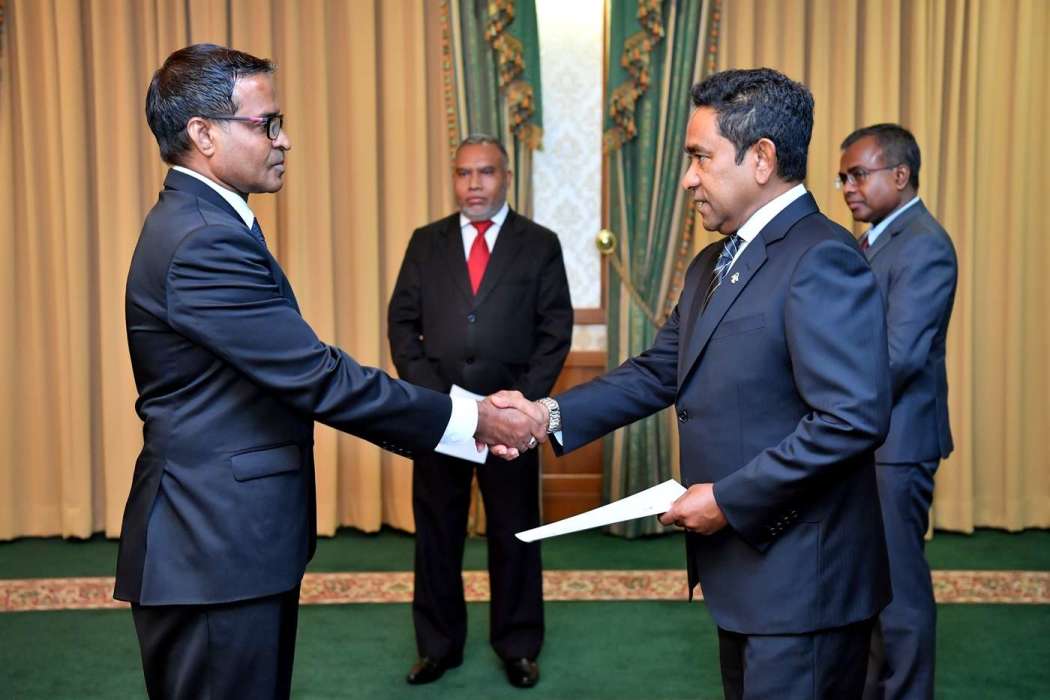 ސުޕްރީމް ކޯޓުގެ ކުރީގެ ފަނޑިޔާރު އަބްދުލްޣަނީ މުހައްމަދު ފަނޑިޔާރު ކަމުގެ ހުވާ ކުރެއްވުމަށް ފަހު އޭރުގެ ރައީސް އަބްދުالله ޔާމީނާ ސަލާމް ކުރައްވަނީ: އުއްތަމަ ފަނޑިޔާރަކަށް އޭނާ އައްޔަންކުރަން މަޖިލީހަށް ވަނީ ހުށަހަޅާފައި -- ފޮޓޯ: ރައީސް އޮފީސް