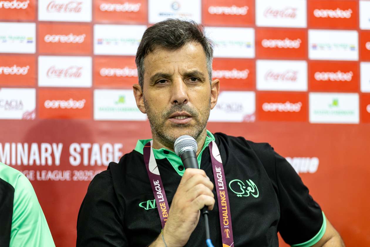 އަލް އަރާބިގެ ކޯޗު މާކޯ އަލްވޭސް، މެޗަށް ފަހު އޮތް ނޫސްވެރިންގެ ބައްދަލުވުމުގައި ވާހަކަ ދައްކަނީ.---- ފޮޓޯ: އަތޫފް އާތިފް / އަދަދު ސްޕޯޓްސް