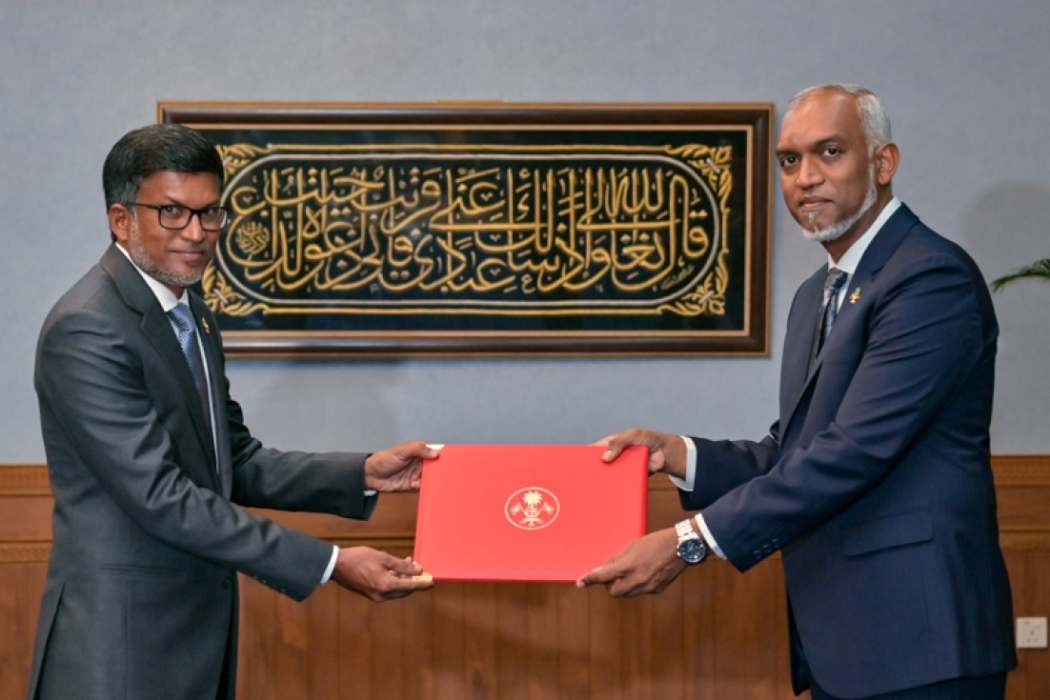 ސްޕޯޓްސް މިނިސްޓްރީގެ ސްޓޭޓްގެ މަގާމަށް ރިޔާޒު އައްޔަންކުރި ދުވަހު އޭނާއަށް ރައީސް މުއިއްޒު މަގާމުގެ ފަތްކޮޅު އަރުވަނީ --- ފޮޓޯ: ރައީސް އޮފީސް