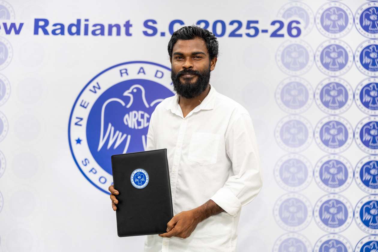 ނިއު ރޭޑިއަންޓްގެ ކޮންޓްރެކްޓްގައި ސޮއިކުރުމަށް ފަހު އިރޭ ފޮޓޯ އަކަށް ހުއްޓިލައިގެން.---- ފޮޓޯ: އަތޫފް އާތިފް / އަދަދު ސްޕޯޓްސް