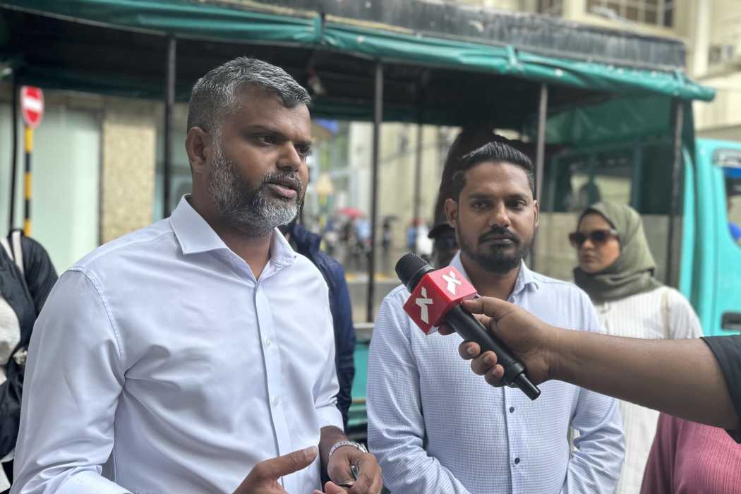 ފުލުހަށް ހާޒިރުވުމަށްފަހު ހުސައިން ނޫސްވެރިންނަށް މައުލޫމާތު ދެނީ -- ފޮޓޯ: ޝާފިއު