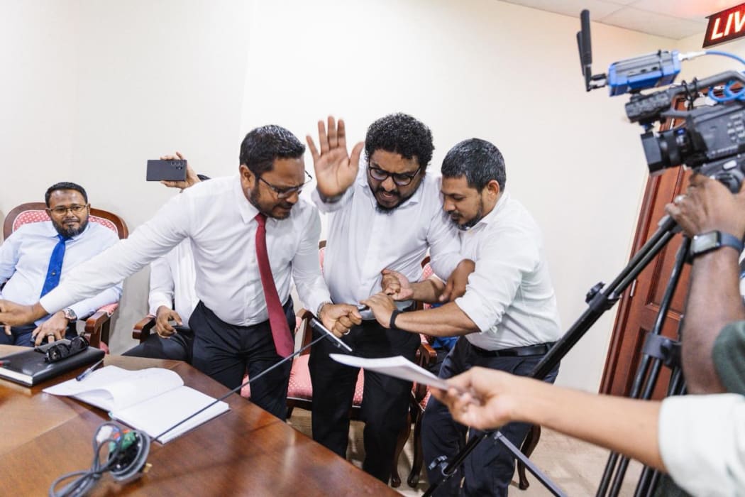 ސެޕްޓެމްބަރު 15، ގައި ކޮމިޓީ ބައްދަލުވުމުގައި މައިކު ހަލާކުވީ ޕީއެންސީއަށް ނިސްބަތްވާ ހެންވޭރު ދެކުނު ދާއިރާގެ މެންބަރު ހުސައިން އިމްރާން ލަތީފް އާއި އެމްޑީޕީއަށް ނިސްބަތްވާ ކެންދޫ ދާއިރާގެ މެންބަރު މައުރޫފް ޒާކިރު އާއި ތޮއްޑޫ ދާއިރާގެ މެންބަރު ހުސައިން ސަމީރު މައިކުގައި ހިފަައިގަތް ވަގުތު އެވެ.