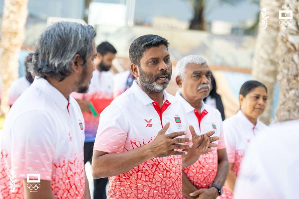 ބަހުރޭނުގައި ހުންނަވައި މިނިސްޓަރު ރާފިއު އެތުލީޓުންނާ ވާހަކަ ދައްކަވަނީ.،--- ފޮޓޯ: މޯލްޑިވްސް އޮލިމްޕިކް ކޮމިޓީ