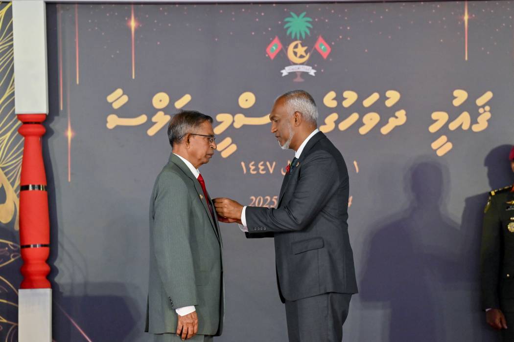 މި އަހަރުގެ ގައުމީ ދުވަހުގެ ޖަލްސާގައި ހއ. އުތީމު، އަލިމަސްގެ، އާދަމް އަބްދުއްރަހްމާން (އުތީމު އާދަމްބެ) އަށް ނިޝާން ދިޔަމިނގިލީ ޝަރަފުގެ އިއްޒަތް އަރުވަނީ --- ފޮޓޯ: ރައީސް އޮފީސް