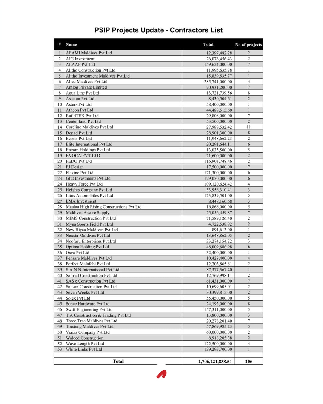 މިއަދު މަޝްރޫއުތައް ހަވާލުކުރި ކުންފުނިތަކުގެ ތެރެއިން އެންމެ ގިނައިން ފައިސާ ލިބެނީ އަލްޓެކް މޯލްޑިވްސް ޕްރައިވެޓް ލިމިޓެޑް އަށެވެ. އެ ކުންފުންޏަށް 285.7 މިލިއަން ރުފިޔާގެ މަޝްރޫއު ހަވާލުކުރިއިރު، ފްލެކްސިންކް ޕްރައިވެޓް ލިމިޓެޑްއަށް 171.3 މިލިއަން ރުފިޔާ، އަލާފް ޕްރައިވެޓް ލިމިޓެޑްއަށް 159.6 މިލިއަން ރުފިޔާ އަދި ސްވިފްޓް އިންޖިނިއަރިން ޕްރައިވެޓް ލިމިޓެޑްއަށް 157.3 މިލިއަން ރުފިޔާގެ މިއަދު ހަވާލުކުރި އެވެ.