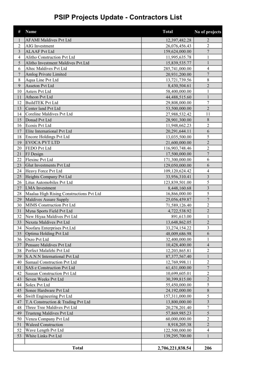 މަޝްރޫއުތައް ހަވާލުކުރި ކުންފުނިތަކުގެ ތެރެއިން އެންމެ ގިނައިން ފައިސާ ލިބެނީ އަލްޓެކް މޯލްޑިވްސް ޕްރައިވެޓް ލިމިޓެޑް އަށެވެ. އެ ކުންފުންޏަށް 285.7 މިލިއަން ރުފިޔާގެ މަޝްރޫއު ހަވާލުކުރިއިރު، ފްލެކްސިންކް ޕްރައިވެޓް ލިމިޓެޑްއަށް 171.3 މިލިއަން ރުފިޔާ، އަލާފް ޕްރައިވެޓް ލިމިޓެޑްއަށް 159.6 މިލިއަން ރުފިޔާ އަދި ސްވިފްޓް އިންޖިނިއަރިން ޕްރައިވެޓް ލިމިޓެޑްއަށް 157.3 މިލިއަން ރުފިޔާގެ މިއަދު ހަވާލުކުރި އެވެ.