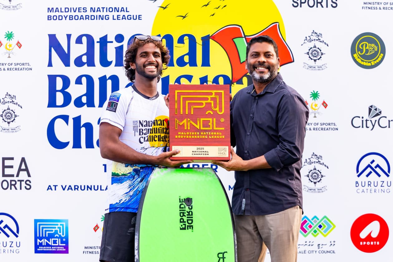 މި ފަހަރުގެ ގައުމީ ބޮޑީބޯޑިން ލީގުގެ ޗެމްޕިއަން އާމިން (ވ) އާއި ޖޫނިއާ ބައިގެ ޗެމްޕިއަން، އިޔަން.---- ފޮޓޯ: އަދަދު ސްޕޯޓްސް/ އިމޭޖަސް.އެމްވީ