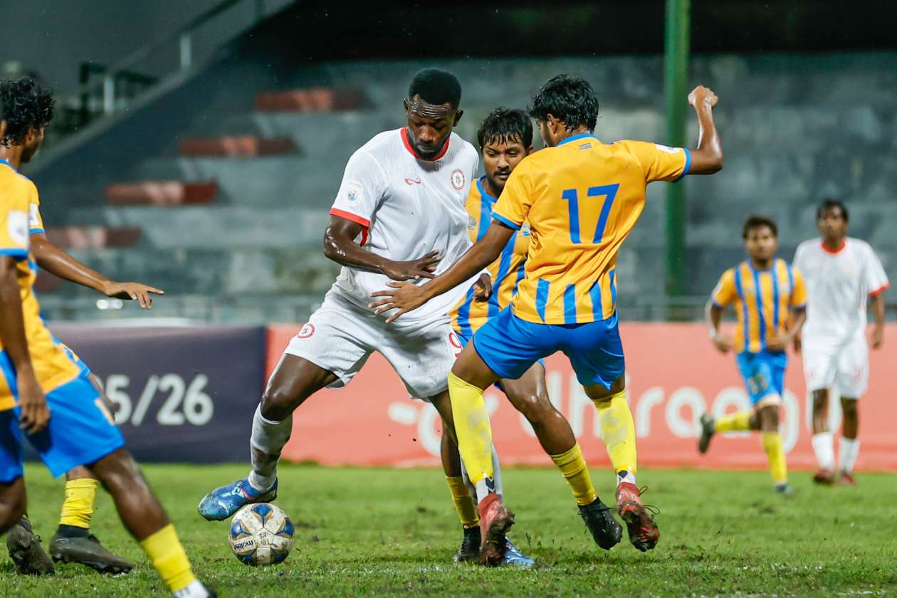 ވެލެންސިއާގެ ހައިޝަމް އާއި ސިޒާން ކައިރިން ބުރުގެ ހުޑްސަން ޑިއާޒް ބޯޅަހިފައިގެންދާން މަސައްކަތްކުރަނީ.--- ފޮޓޯ: ރާއިފް ޔޫސުފް / އަދަދު ސްޕޯޓްސް