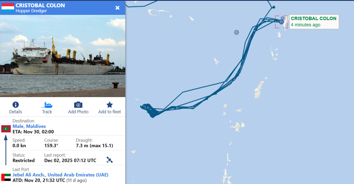 Muizzu announced the arrival of the dredger Cristóbal Colón, operated by Jan De Nul, on a post on social media X on Monday. It arrived on November 30 and began work on December 1.