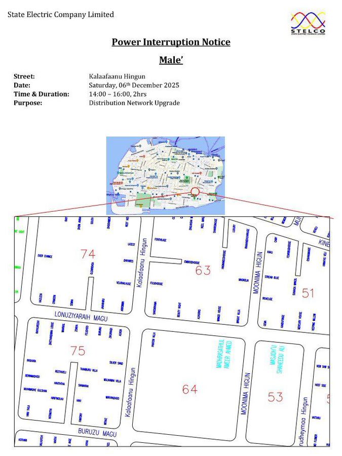 ސްޓެލްކޯއިން އެކްސްގައި ކޮށްފައިވާ ޕޯސްޓެއްގައި ބުނީ އެ ކުންފުނީގެ ކަރަންޓު ވިއުގަ އަޕްގްރޭޑު ކުރުމުގެ މަސައްކަތަށް މިއަދުގެ މެންދުރު ފަހު 2:00 އިން 4:00 އާ ދެމެދު ކަރަންޓު ކެނޑުން އެކަށީގެންވަނީ ކަލާފާނު ހިނގުން ހިމެނޭ ސަރަހައްދުން ކަމަށެވެ.