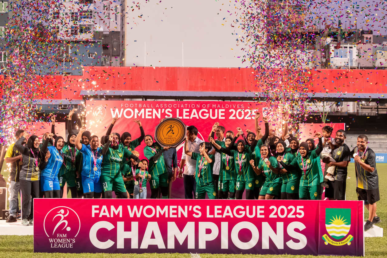 މާޒިޔާގެ ކުޅުންތެރިންނާއި އޮފިޝަލުން އެފްއޭއެމް ވިމެންސް ފުޓްބޯލް ލީގުގެ ތަށްޓާ އެކު އުފާފާޅުކުރަނީ.---- ފޮޓޯ: އަދަދު ސްޕޯޓްސް / އިމޭޖަސް.އެމްވީ