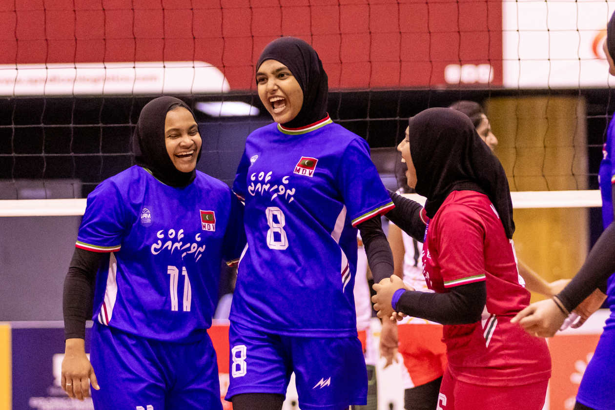 ގައުމީ އަންހެން ވޮލީބޯޅަ ޓީމުގެ ކުޅުންތެރިން މިރޭގެ މެޗުގެ ތެރެއިން އުފާފާޅުކުރަނީ.--- ފޮޓޯ: ރާއިފް ޔޫސުފް / އަދަދު ސްޕޯޓްސް