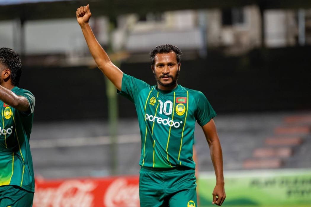 މާޒިޔާގެ ފުރަތަމަ ލަނޑު ޖެހި ޗޯޓު (ކ) އެ ލަނޑު ޖަހަން ފުރުސަތު ތަނަވަސްކޮށްދިން އިލާންއާ އެކު: މާޒިޔާ އިން މި މެޗުގައި ޖެހި ތިން ގޯލަށް ވެސް ފުރުސަތު ހޯދައިދިނީ އިލާން.---- ފޮޓޯ: އަދަދު ސްޕޯޓްސް / އިމޭޖަސް.އެމްވީ