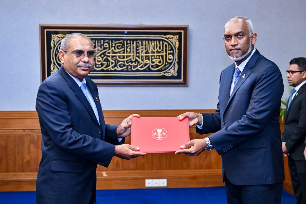 ރައީސް މުހައްމަދު މުއިއްޒު އިލެކްޝަންސް ކޮމިޝަންގެ ރައީސް މުހައްމަދު ޒާހިދު އަށް މަގާމުގެ ފަތްކޮޅު އަރުވަނީ ---- ފޮޓޯ: ރައީސް އޮފީސް