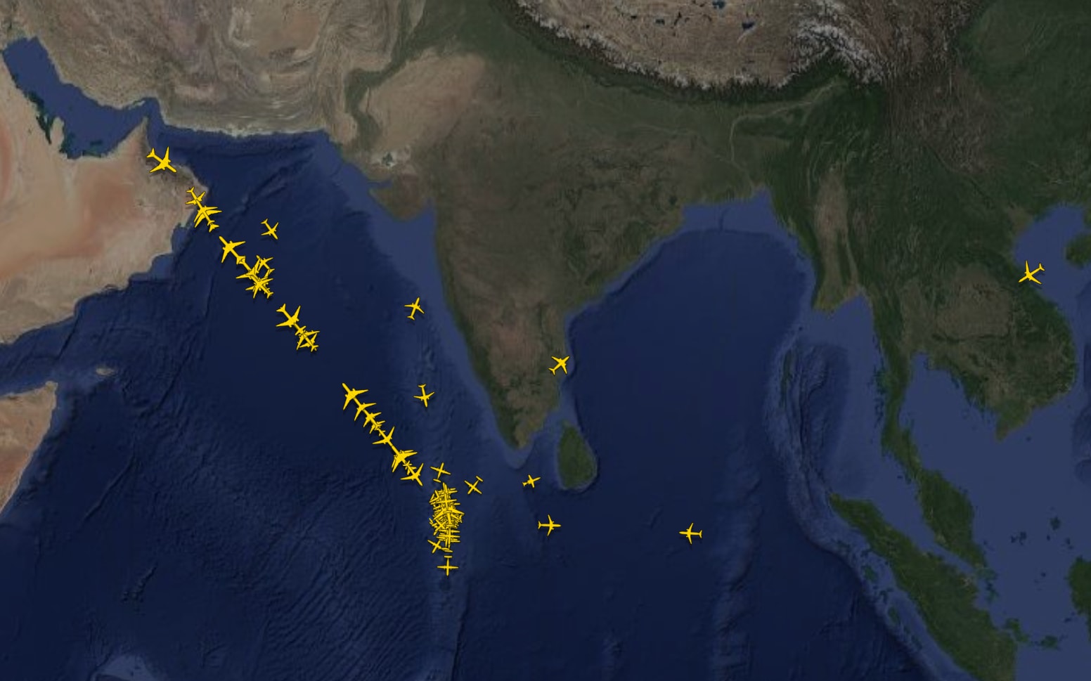 މިވަގުތު ވީއައިއޭ އިން ފުރައިގެން އަދި ވީއައޭގައި ޖެއްސުމަށް ދަތުރުކުރަމުންދާ ފުލައިޓުތައް ---- ފޮޓޯ: ފްލައިޓު ރާޑަރު