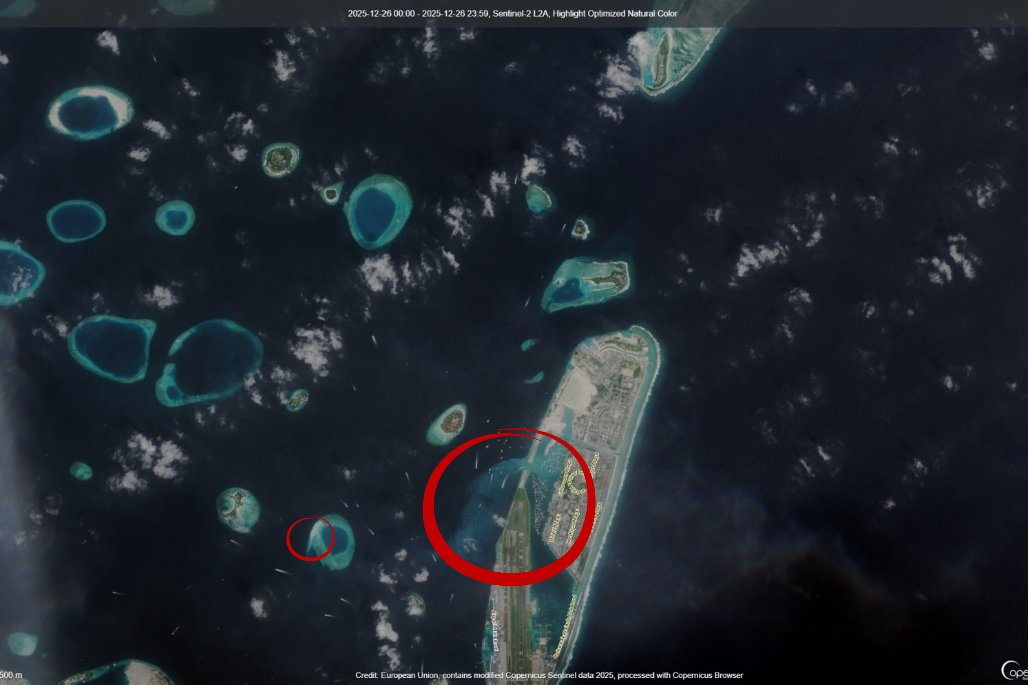 ރަސްމާލެއިން ގިރަމުންޑާ ވެއްޔާއި، ޑްރެޖަރު ވެލި ނެގުމުން ކިލަނބު ވަމުންދާ މަންޒަރު ސާފުކޮށް ފެންނަ މާލެ އަތޮޅު ދެކުނު ބުރީގެ ސެޓްލައިޓު ފޮޓޯއެއް ---- ފޮޓޯ: ސެންޓިނެލް 2