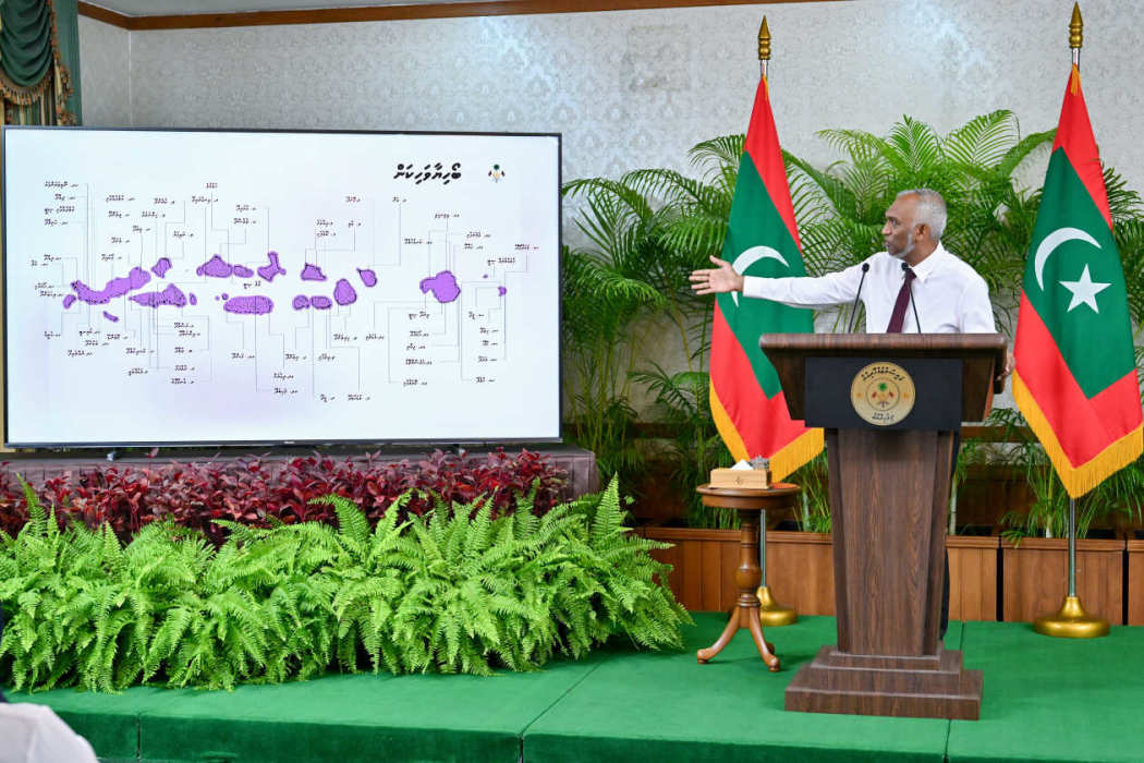 މިދިޔަ މެއި މަހު ރައީސް މުއިއްޒު ބޭއްވި ނޫސްވެރިންގެ ބައްދަލުވުމެއްގައި އެކި ރަށްރަށުގައި ހިންގަން ނިންމާފައިވާ ބޯހިޔާވަހިކަމުގެ މަޝްރޫއުތަކުގެ ތަފުސީލު ދެއްވަނީ ---- ފޮޓޯ: ރައީސް އޮފީސް