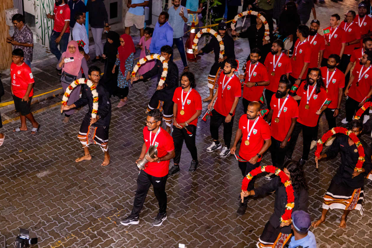 ގައުމީ ފުޓްސަލް ޓީމަށް މަރުހަބާ ކިޔުމަށް ރޭ ބޭއްވި އިވެންޓްގެ ތެރެއިން.---- ފޮޓޯ: އަދަދު ސްޕޯޓްސް / އިމޭޖަސް،އެމްވީ
