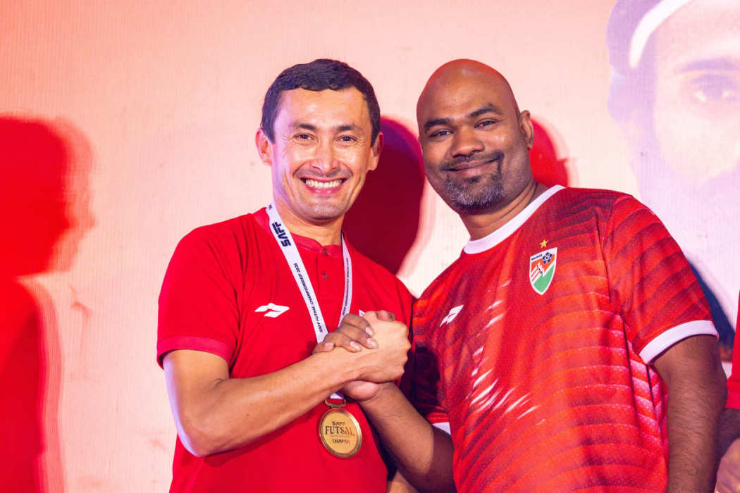 ގައުމީ ފުޓްސަލް ޓީމުގެ ކޯޗު ފާރޫކް (ވ) އާއި ގޯލްޑަން ފުޓްސަލް އެސޯސިއޭޝަންގެ ރައީސް ރިލްވާން (ކ).--- ފޮޓޯ: އަދަދު ސްޕޯޓްސް / އިމޭޖަސް،އެމްވީ
