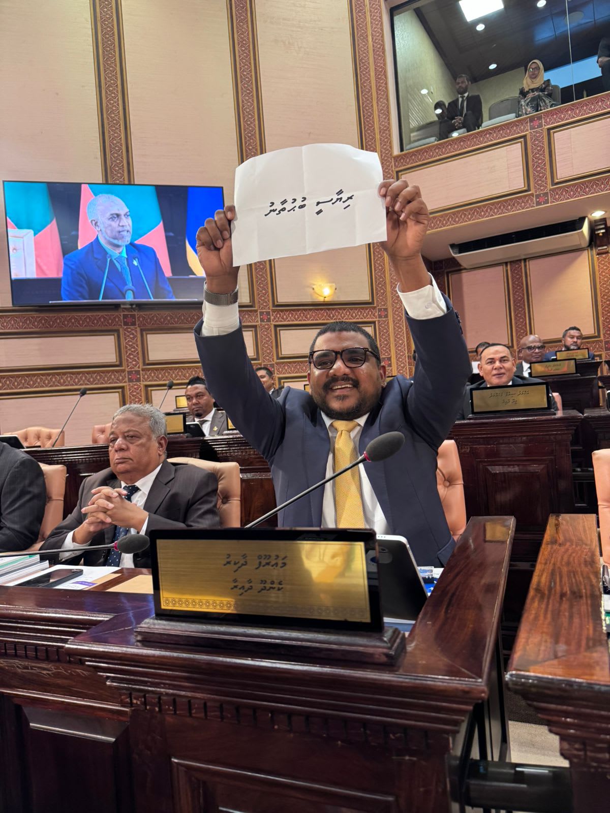 މިއަދުގެ ޖަލްސާގައި އެމްޑީޕީން އިހުތިޖާޖު ކުރަމުންދާއިރު، މުއިއްޒު ގެންދަވަނީ އިހުތިޖާޖަށް ބެއްލެވުމެއް ނެތި، ތަހުރީރު ކުރިއަށް ގެންދަވަމުންނެވެ.