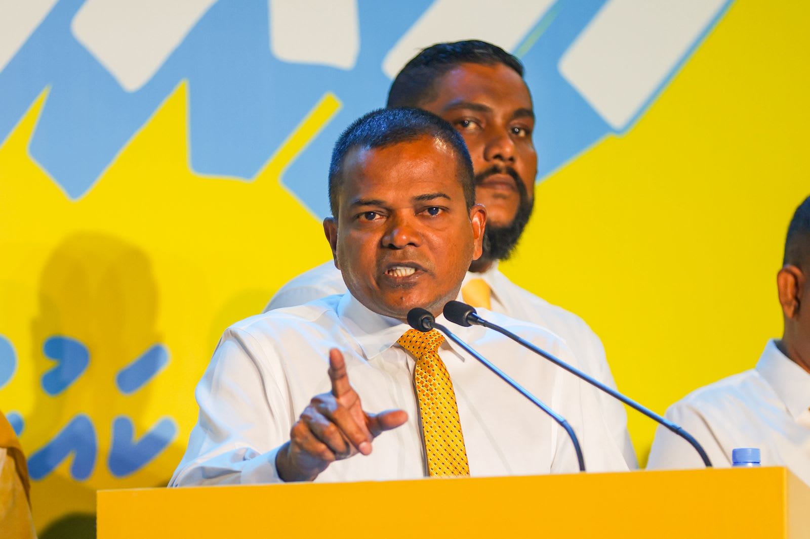 ފުވައްމުލަކު މޭޔަރު އިސްލާއީލް ރަފީގު އެމްޑީޕީގެ ރޭގެ ޖަލްސާގައި ވާހަކަ ދައްކަވަނީ. -- ފޮޓޯ: މުހައްމަދު ޝަހުޒާން/އަދަދު