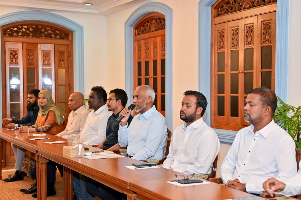 މާލޭ ހިޔާ އަދި ސިނަމާލެ ފްލެޓުތަކުގެ ބައެއް ވެރިންނާ މުއިއްޒު އިއްޔެ މުލިއާގޭގައި ބައްދަލު ކުރައްވަނީ. -- ފޮޓޯ: ރައީސް އޮފިސް