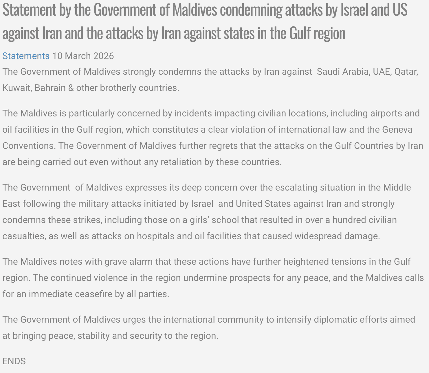މިއަދު ފޮރިން މިނިސްޓްރީން އިނގިރޭސި ބަހުން ނެރުނު ބަޔާނުގައި ވެސް އެންމެ ފުރަތަމަ ކުށްވެރިކޮށްފައި އޮތީ އިރާނުން ގަލްފުގެ ގައުމުތަކަށް ދެމުންދާ ހަމަލާތަކެވެ. އިރާނުން ހަމަލާ ދެމުން އަންނަނީ އެ ގައުމުތަކުގެ ސަރަހައްދުތައް ބޭނުންކޮށްގެން އެމެރިކާ އާއި އިޒްރޭލުން ހަމަލާ ދެމުން އަންނާތީ އެވެ.