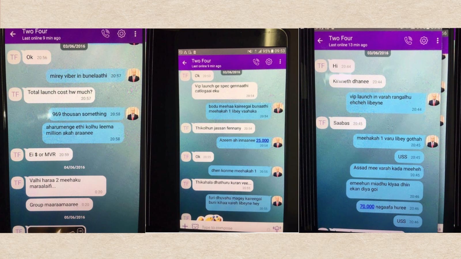 އެ މައްސަލަ އޭރު ފެންމަތިވެގެން އުޅުނުއިރު، ޓޫފޯ އާއި ޖަމްޝީދު ވައިބާއިން ދައްކާފައިވާ ކަމަށް ބެލެވޭ ވާހަކަތަކެއްގެ ސްކްރީން ޝޮޓުތަކެއް ވެސް ދައުރުވި އެވެ. އޭސީސީއަށް ހުށަހެޅި މައްސަލައާއެކު އެ ސްކްރީން ޝޮޓުތައް ވެސް ހުށަހަޅާފައިވެ އެވެ.
