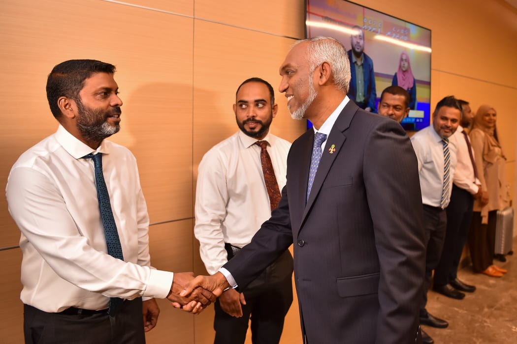 ރައީސް މުއިއްޒު އަދި ސްޕޯޓްސް މިނިސްޓަރު ރާފިއު. ރަށްރަށުގައި އެކަނި އެ މިނިސްޓްރީގެ 225 ސިޔާސީ މުވައްޒަފުން އެބަ ތިބި