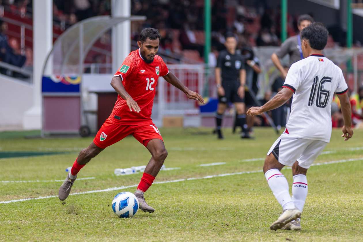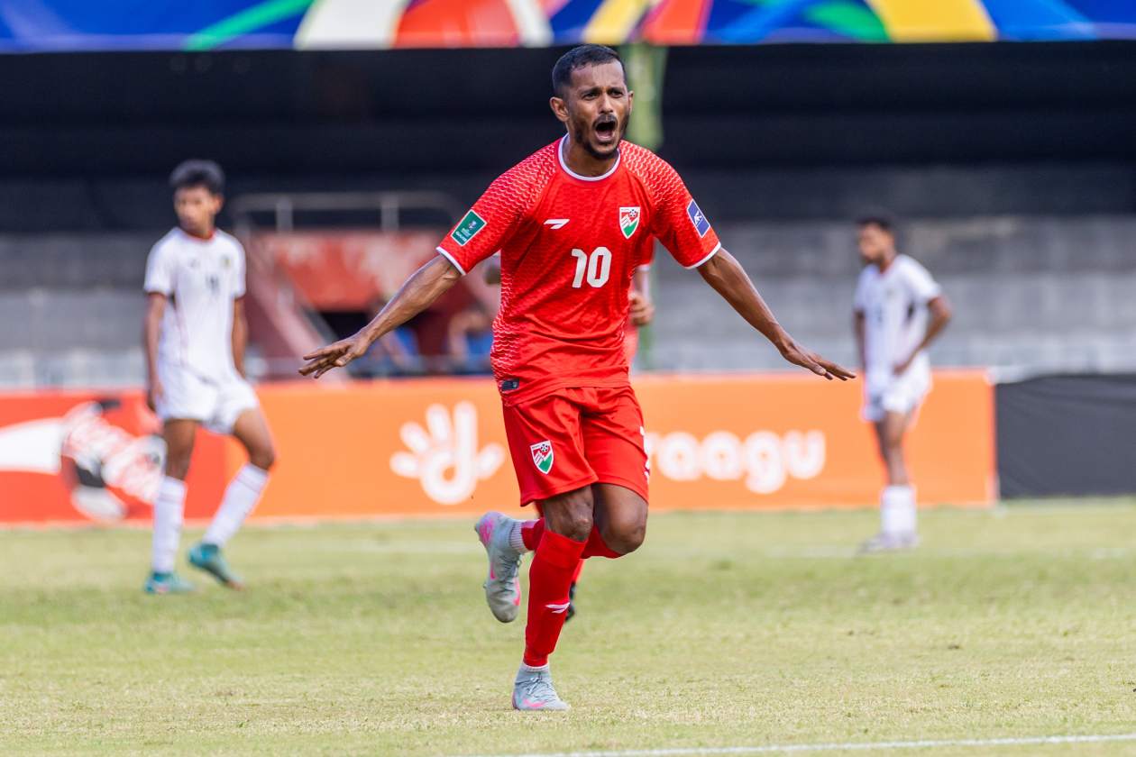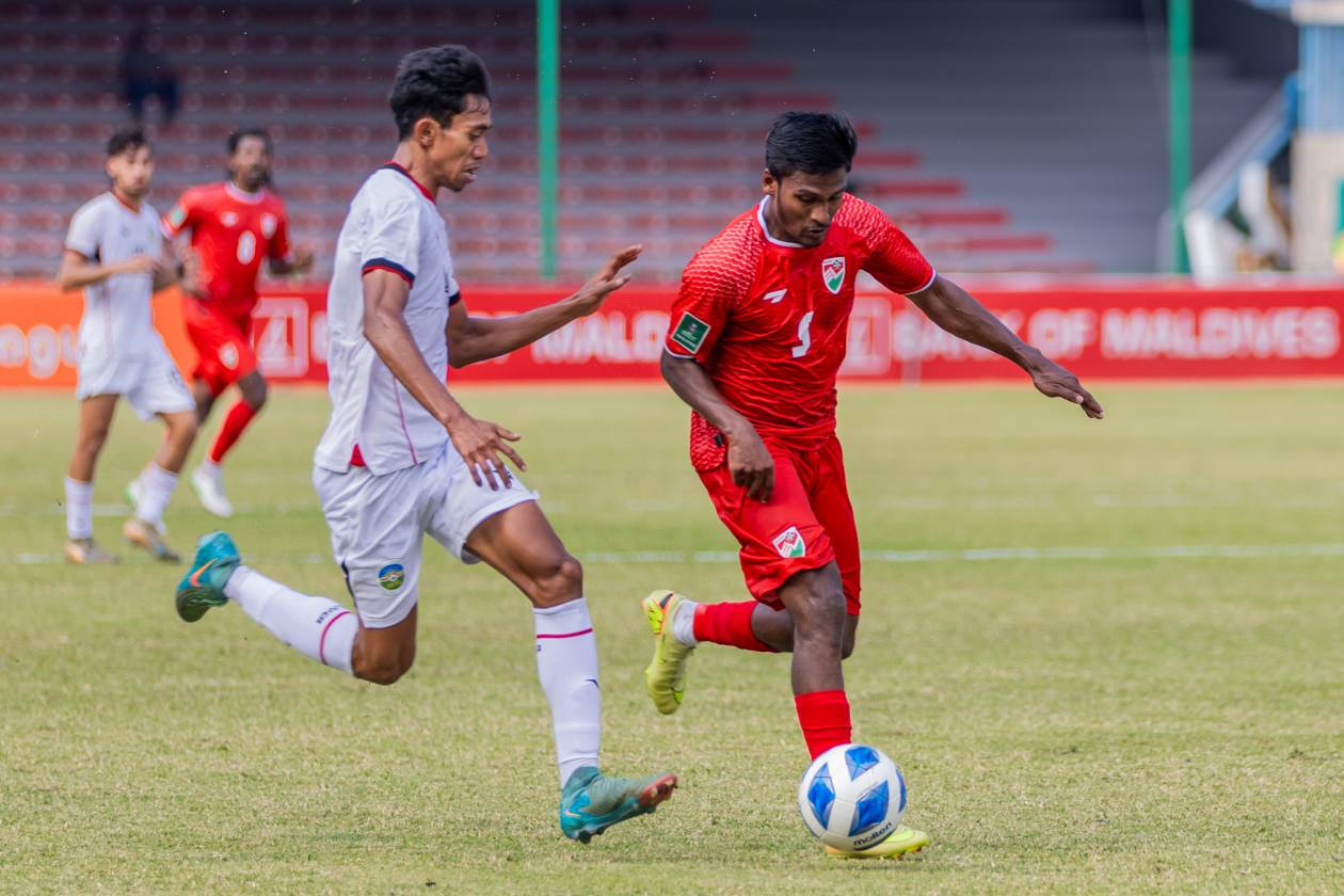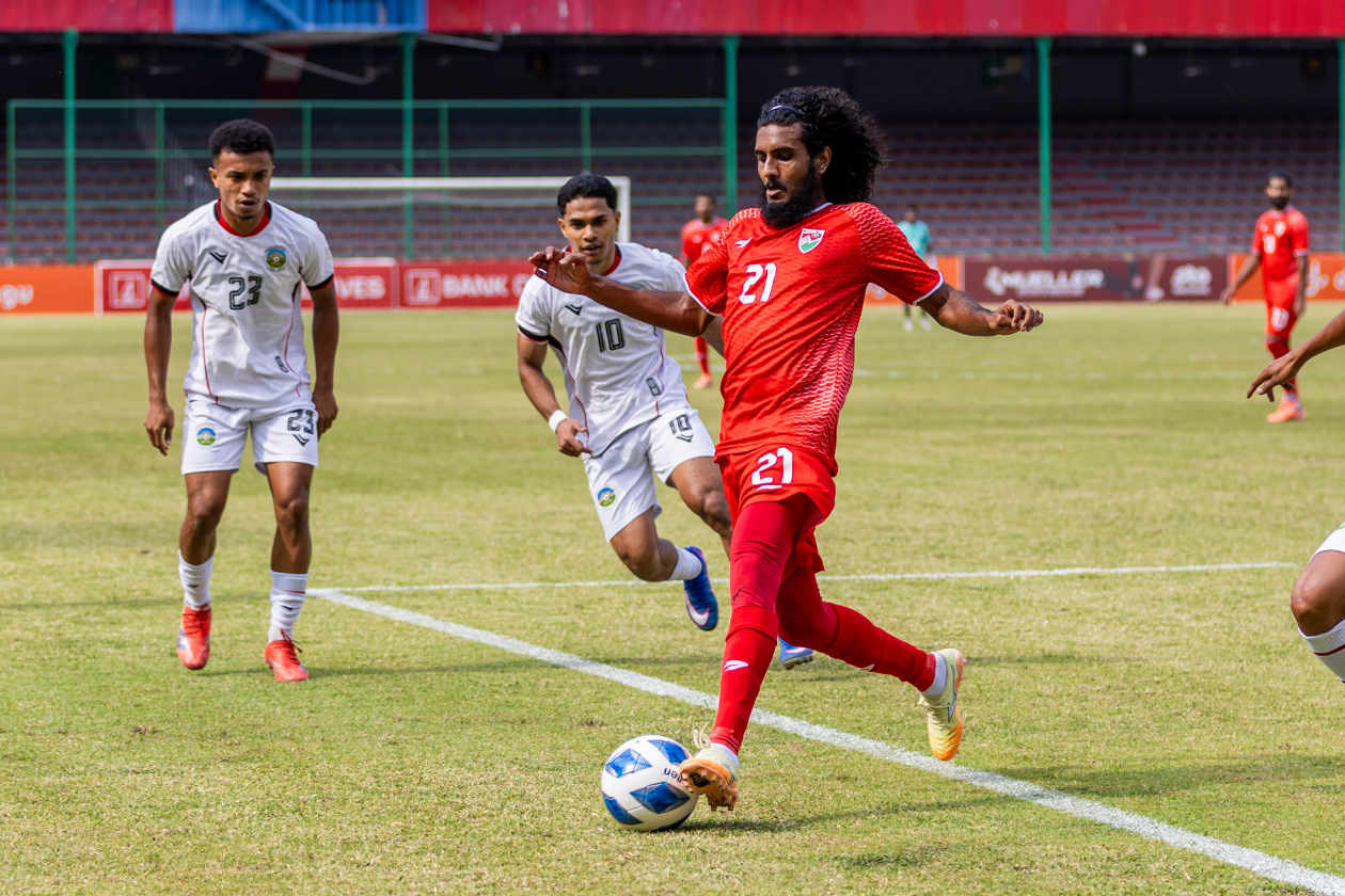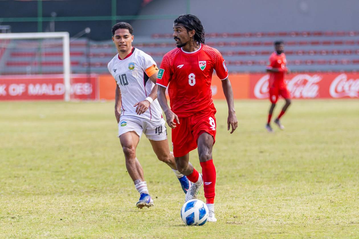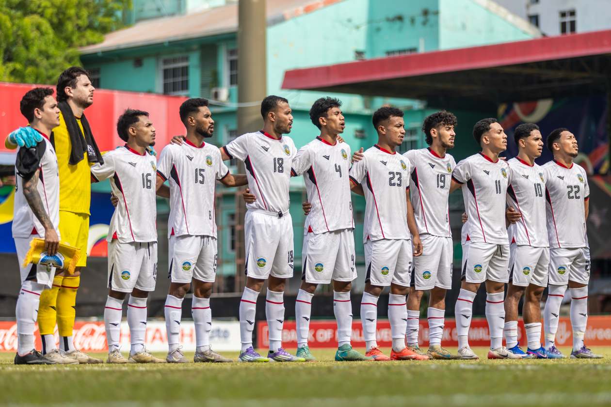 މާލެ، ދިވެހި ރާއްޖެ (އޭޕްރީލް 1) - ސައުދީ އަރަބިއްޔާގައި އަންނަ އަހަރު ބާއްވާ އޭޝިއަން ކަޕްގެ ކޮލިފައިންގައި ރާއްޖޭން ކުޅުނު ފުރަތަމަ ފަސް މެޗުން ބަލިވެފައިވާއިރު، ކުޅުުނު ފަހު މެޗުން ޓިމޯ ލެސްޓޭ އަތުން މޮޅުވެފައިވަނީ މެޗުގެ ފަހު ވަގުތު ޖެހި ދެ ގޯލާ އެކު 2-1 އިން: އިއްޔެގެ މެޗަކީ، ރާއްޖޭން މިދިޔަ ތިން އަހަރު ތެރޭ އަމިއްލަ ގައުމުގައި ކުޅެގެން މޮޅުވި ފުރަތަމަ މެޗު --- ފޮޓޯ: ރާއިފް ޔޫސުފް / އަދަދު ސްޕޯޓްސް