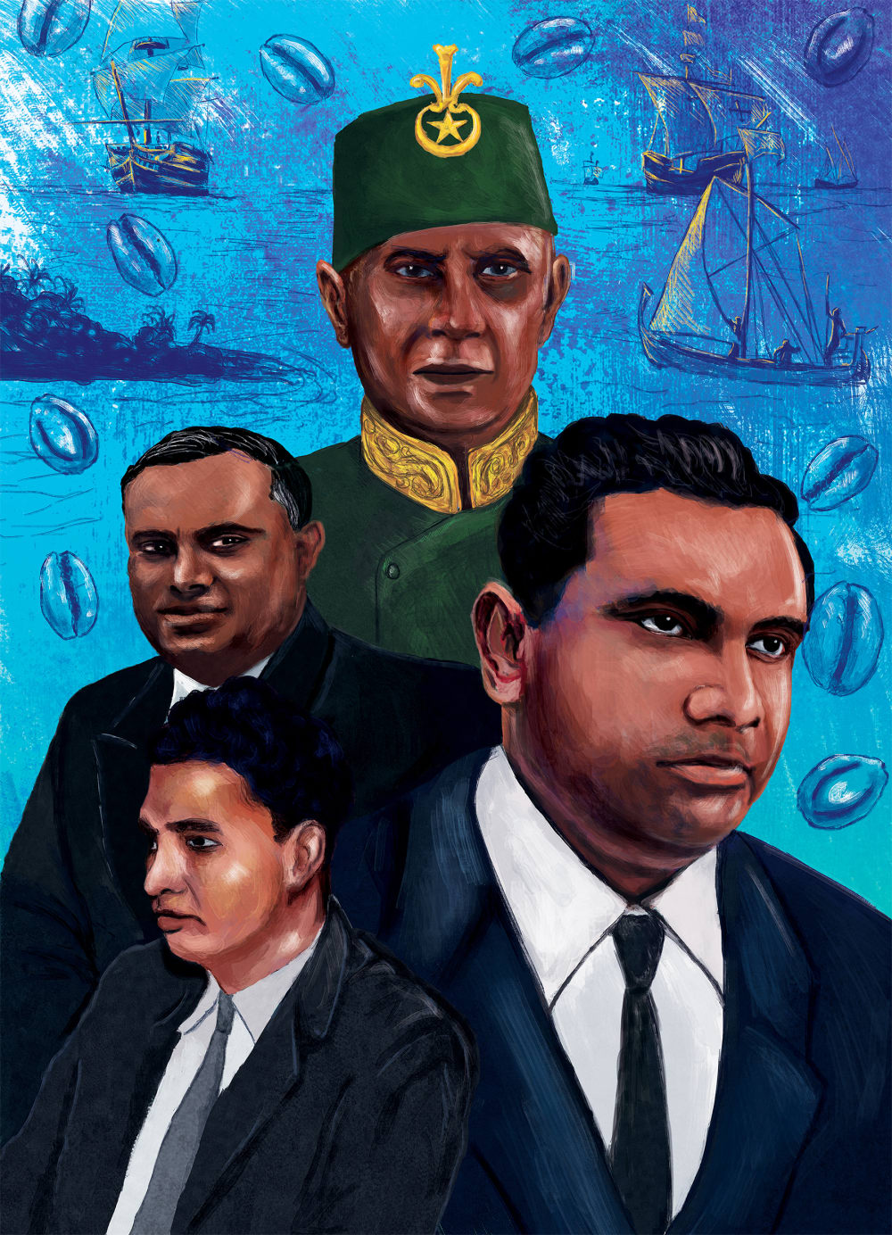 The art work captures the historical figures that played the major roles in the event that lead to the independence of Maldives on 26th July 1965. Sultan Muhammad Fareed Didi in the top center of the art work, on the left Ahmed Hilmy Didi & Abdul Sattar Moosa Did and on the right Ibrahim Nasir who served as Prime Minister of the Maldives under Sultan Mohamed Fareed Didi. Also have tweaked some details in the background inspired by Mohammed Thakurufaan who is one of the National heroes of Maldives.