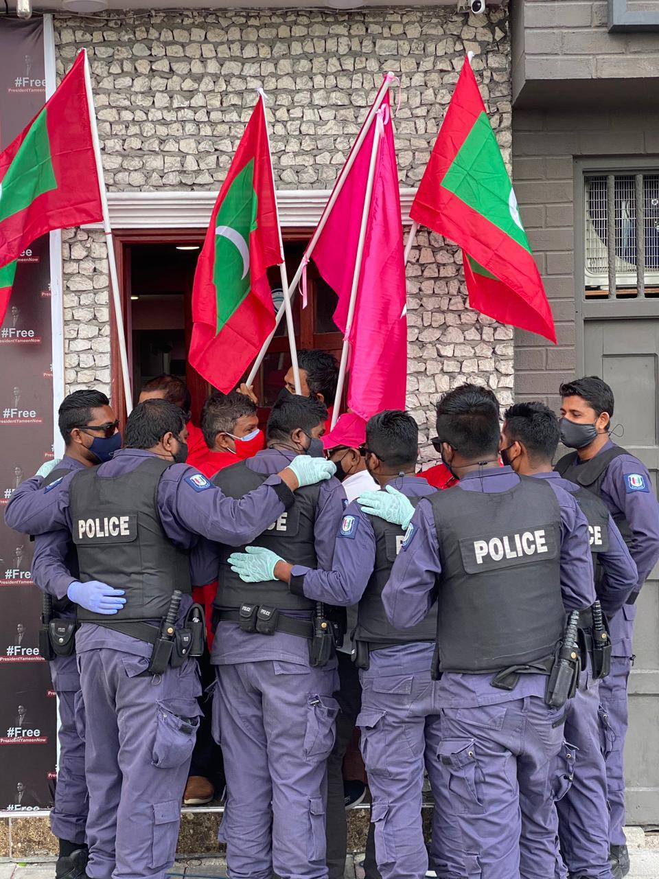 ޕީޕީއެމުން ބޭއްވި މުޒާހަރާއެއް ހުއްޓުވަން ފުލުހުން އެ ޕާޓީގެ އޮފީސް ދޮރު ބަންދުކޮށްގެން. --ފޮޓޯ/ޕީޕީއެމް