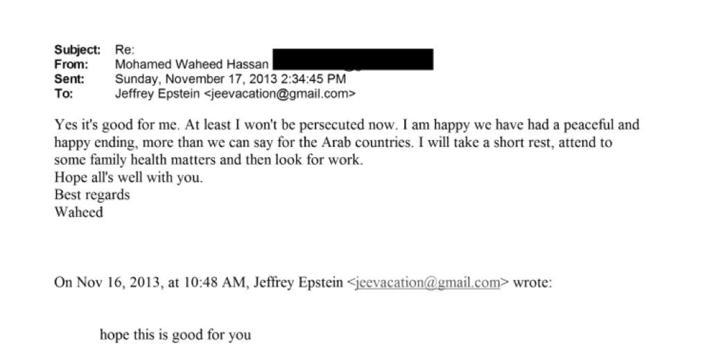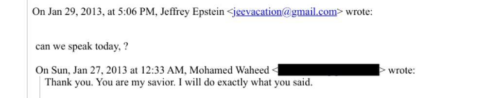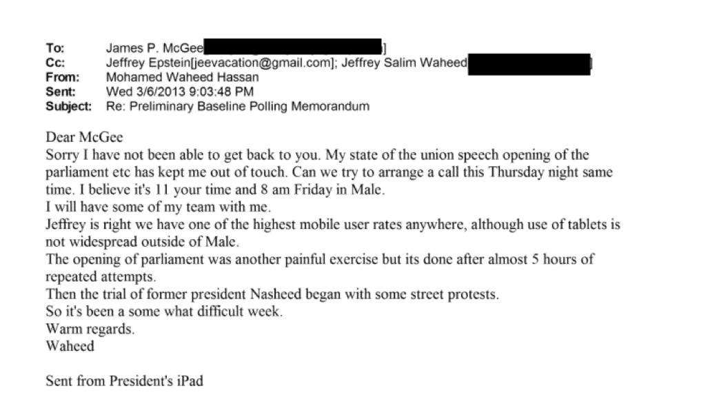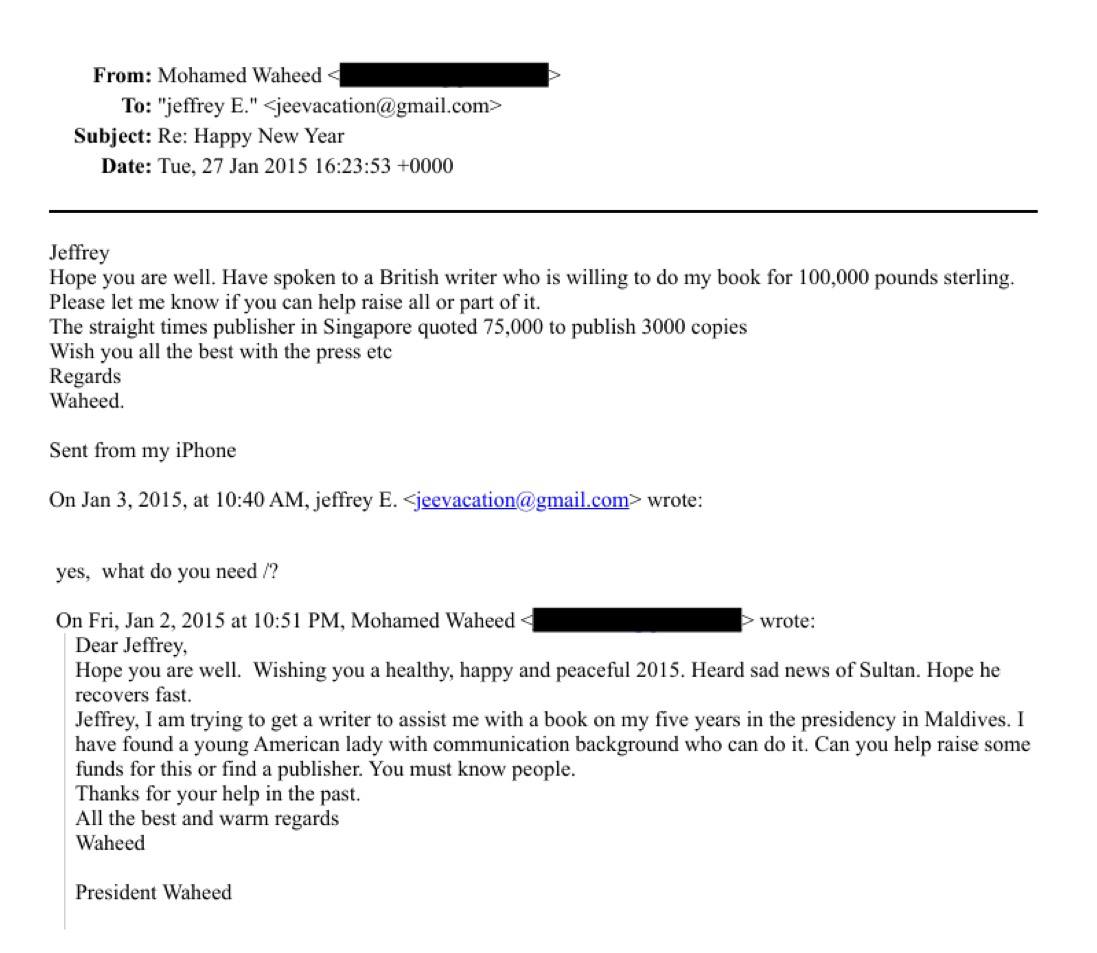 ވަހީދުގެ ދަރިފުޅު، ޖެފްރީ ސާލިމް ވަހީދު އާއެކު ނިއުޔޯކުގައި ހުންނަ އެޕްސްޓީންގެ ގޭގައި 2014 ގައި ބައްދަލުކުރި ކަމާއި އޭގެ އިތުރުން ވެސް އެތައް ފަހަރެއްގެ މަތިން ވަހީދު، އެޕްސްޓީން އާއި ބައްދަލުކުރިކަން ފައިލްތަކުން ހާމަވެ އެވެ. އެޕްރީލް އަދި މެއި، 2014، ޖުލައި، 2015 ގައި މިފަދަ ބައްދަލުވުންތަކެއް ބޭއްވި އެވެ. އަދި، ފްރާންސްގެ ވެރިރަށް ޕެރިހުގައި ހުރި އެޕްސްޓީންގެ އެޕާޓްމަންޓެއްގައި ވެސް ވަހީދު އޭނާއާ ބައްދަލުކުރިކަން އެ އީމެއިލްތަކުން ހާމަވެ އެވެ.