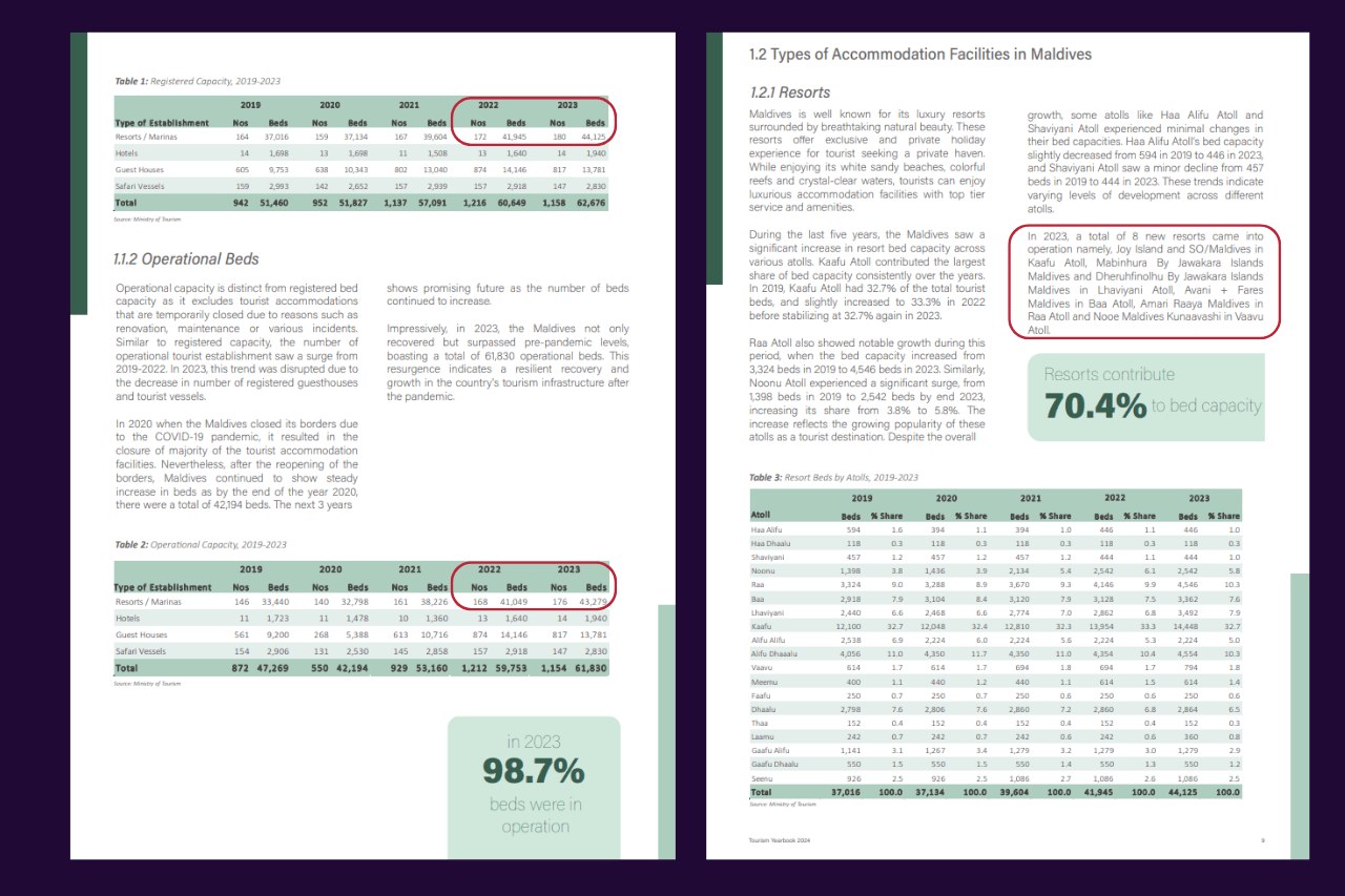 ޓޫރިޒަމް މިނިސްޓްރީން އާންމުކޮށްފައިވާ އެހެން ތަފާސްހިސާބުތަކުން ވެސް ރިސޯޓުތަކެއް ހުޅުވިކަން ސާފުކޮށް އެނގެ އެވެ. މި ކަމަށް ބާރުދޭ އެއް ތަފާސްހިސާބަކީ އެ މިނިސްޓްރީން އާންމުކުރާ ޑެއިލީ ރިޕޯޓުތަކާއި މަންތުލީ ރިޕޯޓުތަކުގައި ވެސް ފެންނަން އޮންނަ ރަޖިސްޓާޑް ކެޕޭސިޓީ އާއި އޮޕަރޭޝަނަލް ކެޕޭސިޓީގެ ނަމްބަރުތަކެވެ.